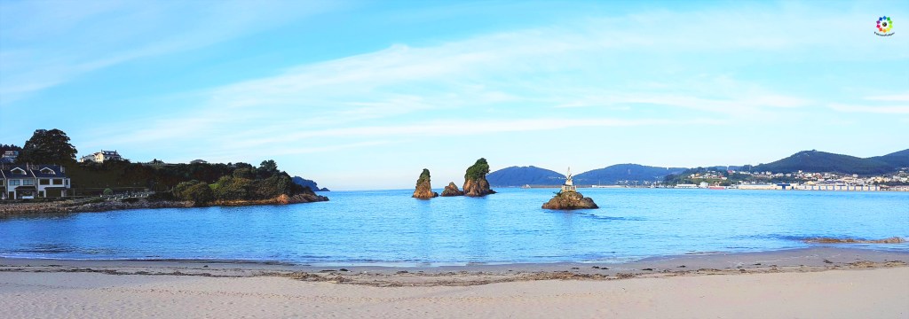 Y no puedes dejar de visitar la Playa de Covas. un arenal urbano bellísimo, en forma de concha, de arena blanca y aguas tranquilas que nos sorpende por las curiosas formaciones rocosas que hacen que en las fotos parezca mas un paisaje asiático, estas formaciones se llaman Castelos y son de tipo pizarroso.