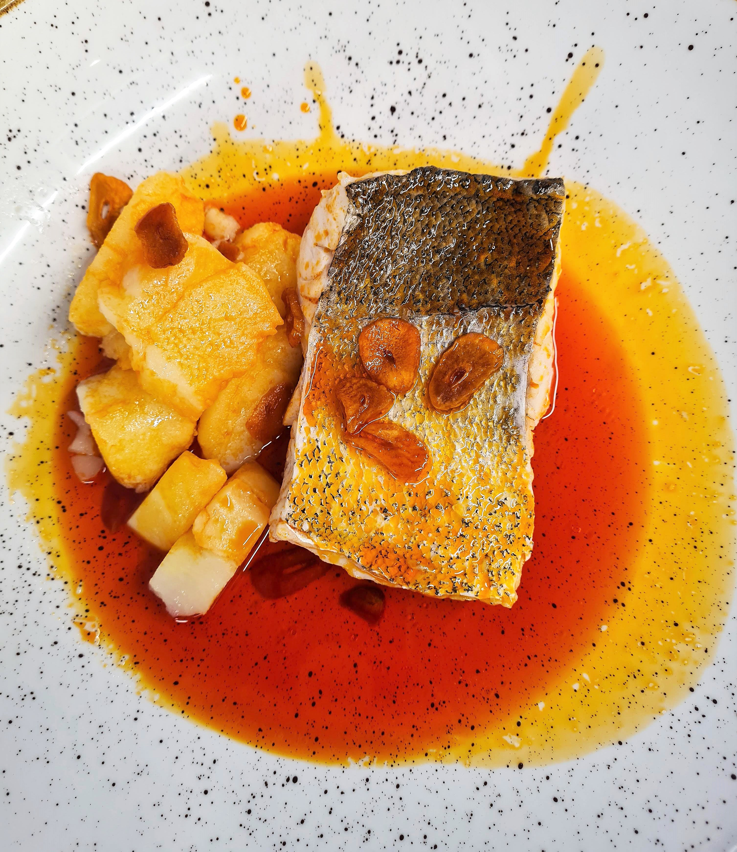 . rape con patata y una crema hecha con la cabeza y las espinas del rape y algas.