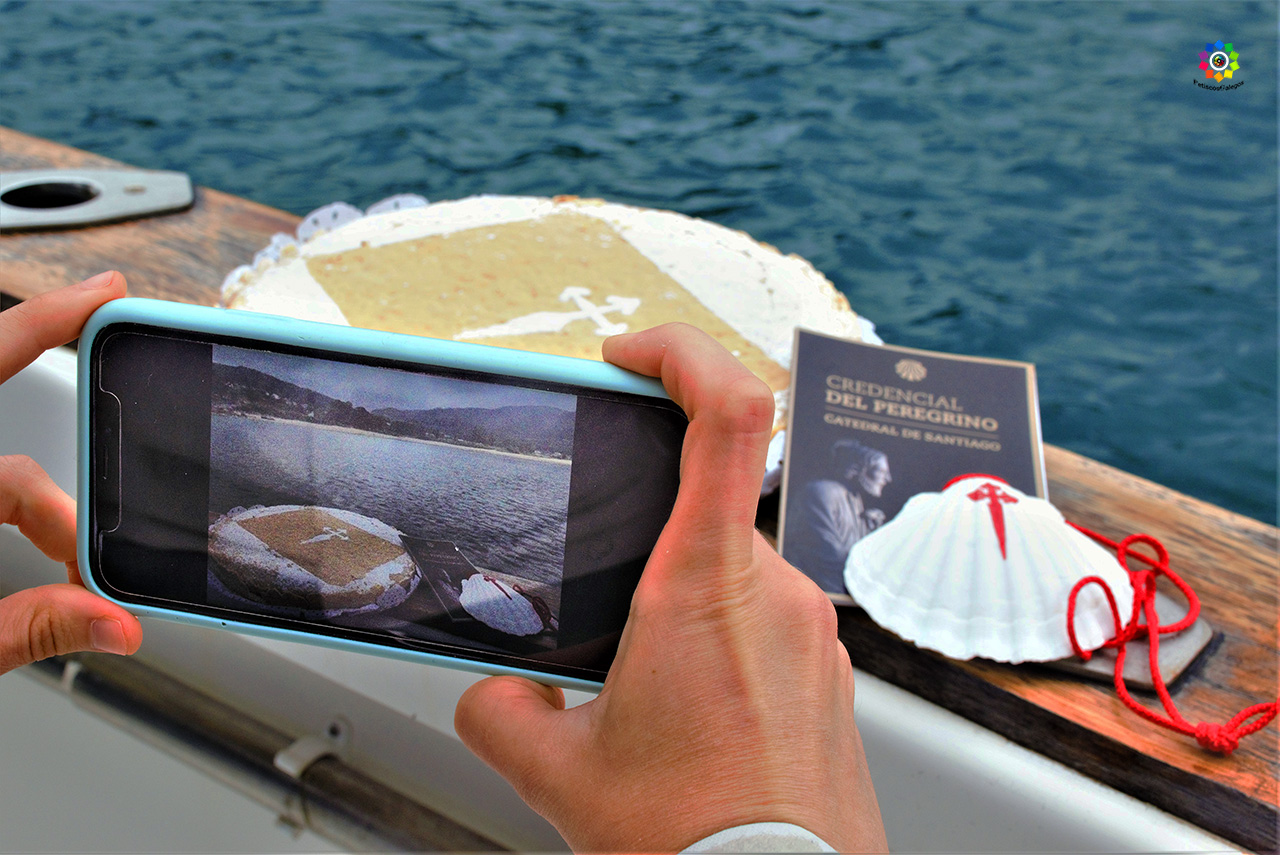 Y en este maravilloso entorno hicimos una pausa en la travesía para disfrutar de nuestros productos gallegos ( os recomiendo aprovechar el Camino para conocer el producto y la gastronomía gallega): un Queso tetilla DOP , acompañado de las típicas galletas marineras gallegas, un vino de la DO Ribeiro y una tarta de Santiago elaborada con la receta original (almendras, azúcar y huevos) .