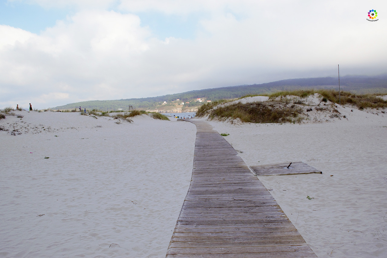 Dominando la playa se encuentra el Monte Pindo y en el extremo norte las marismas de Caldebarcos. El acceso a la playa se realiza a través de una extensa pasarela de madera sobre las dunas.