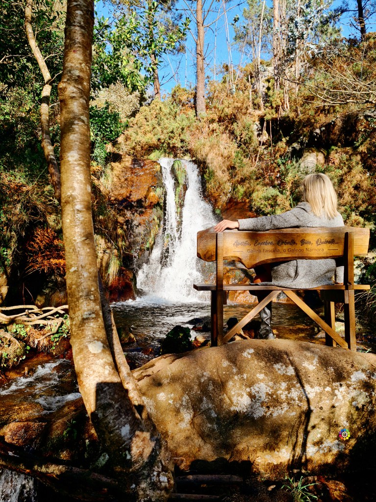 Justo en frente de la fervenza , sobre las rocas, han colocado un banco de madera en cuyo respaldo se lee : » Aperta, Enxebre, Orballo, bico, quérote… Galiza fascina, o Galego Namora «. La foto más bonita es, sin duda, desde la parte de atrás del banco con la fervenza al fondo aunque os advierto que el acceso no es de los más fáciles. Se sitúa justo en medio del curso del agua, así que si no vais en verano y os meteis descalzos hasta el banco contad con llevar calzado apropiado para meter los pies en el agua y tened cuidado porque se resbala.