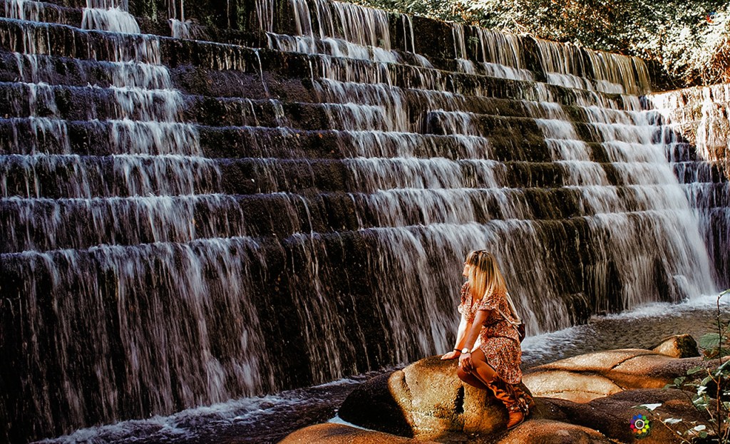 Por el acceso principal , verás un banco y una valla de madera bordeando el sendero que lleva a la vista más bonita de la cascada.