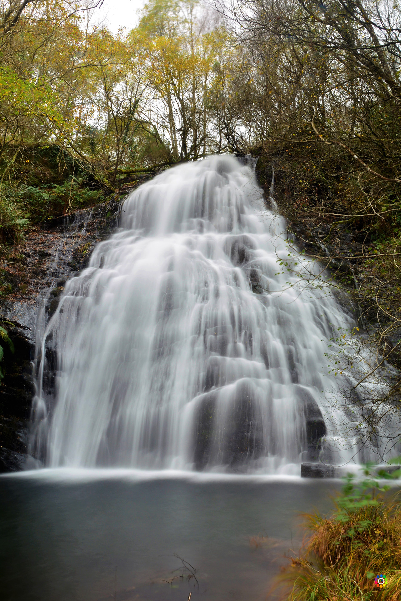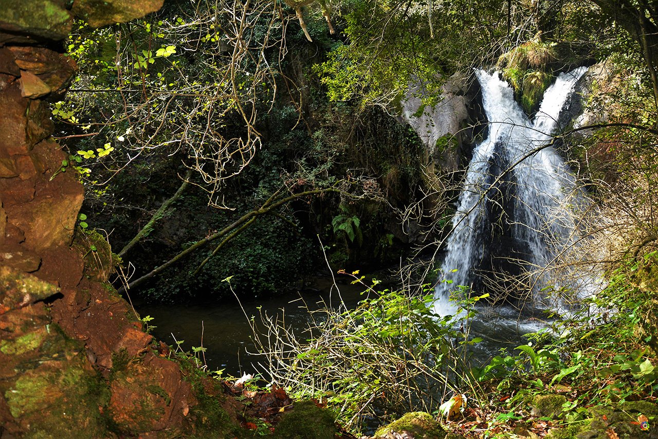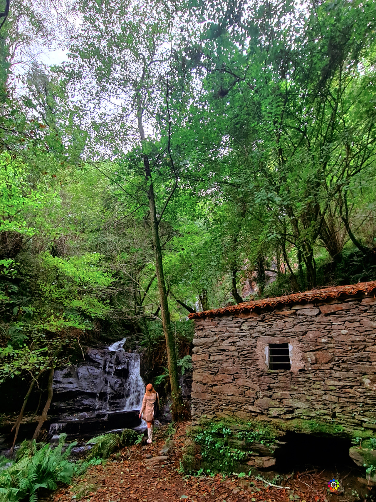 Este es uno de esos lugares que te dejan sin palabras, después de caminar por un precioso sendero rodeado de especies autóctonas con árboles que parecen de un decorado de película , vemos unas escaleras casi ocultas por las hojas que bajan hasta un viejo molino , cuidado al entrar porque está bastante deteriorado y faltan partes del suelo. El interior tiene dos alturas , otras escaleras bajan hasta una parte en la que apenas quedan unas piedras bordeando un hueco de lo que antiguamente fue una pared. Y al acercarnos , la sorpresa, ese hueco nos regala una imagen de postal, una preciosa cascada con dos caídas cruzadas que forma una poza maravillosa antes de seguir su recorrido río abajo. Se puede bajar hasta la base de la cascada , por el lateral del molino , con mucho cuidado porque no hay sendero ni escalones y si está mojado la superficie es bastante resbaladiza.