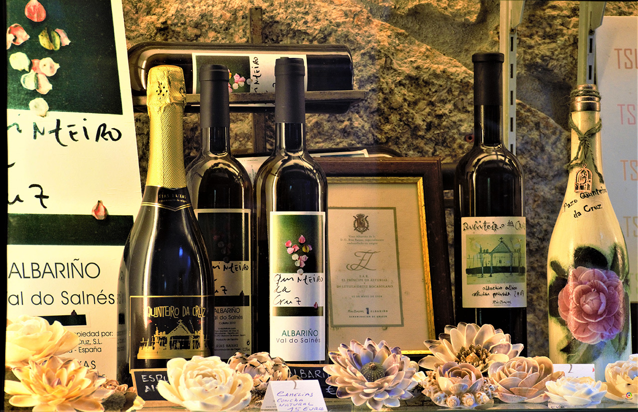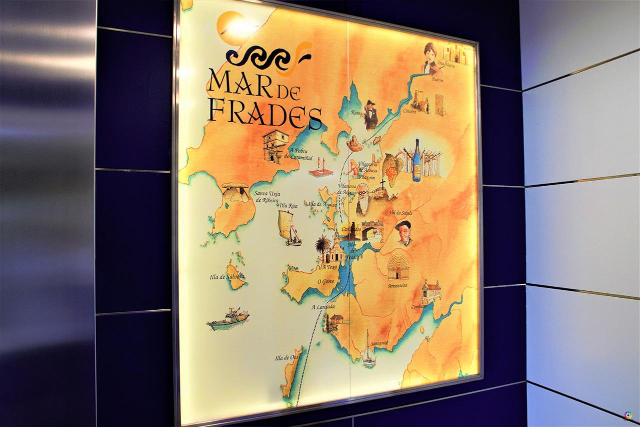 En la bodega podrás ver un precioso mapa obra de María del Carmén Cortés, la esposa de su fundador, el villagarciano Eladio Piñeiro, al parecer ella fue la que tuvo la idea de la ya famosa botella azul. Eladio fundó la botella antes de que se concediera la D.O. Rías Baixas. Y si te fijas en el edificio en el que se ubica la bodega, verás que tiene forma de barco. Como curiosidad…. sabías que las etiquetas de sus vinos son termocrómicas? En ellas se esconde el dibujo de un barco ( concretamente una dorna típica gallega) que solo aparece cuando la botella alcanza la temperatura ideal para su consumo, en torno a los 7/9 grados.