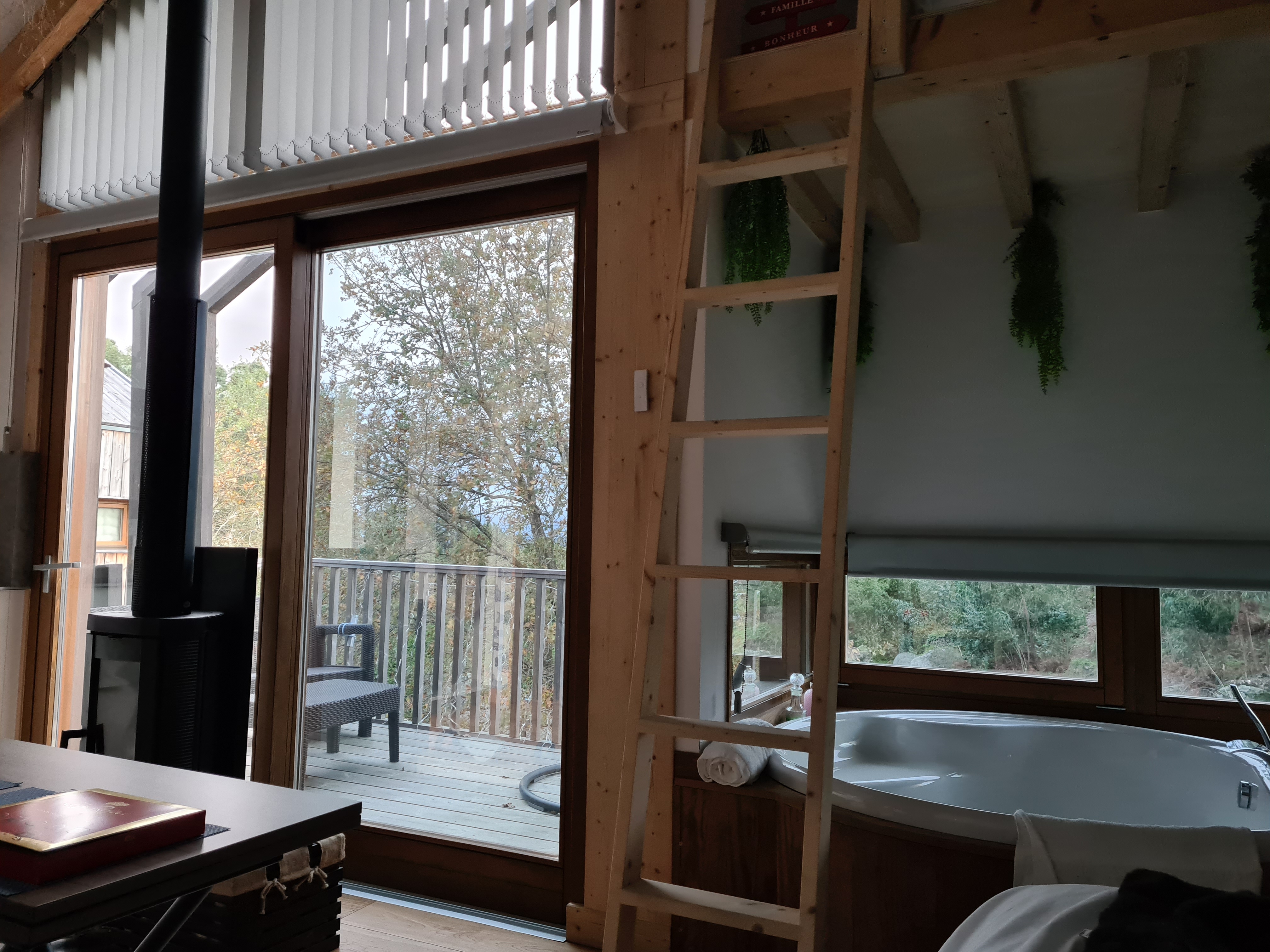 El interior: dos plantas ocupadas por un salón con chimenea y un jacuzzi maravilloso en la parte inferior y el dormitorio, baño y una preciosa terraza en la parte superior . Por supuesto , tienen más estancias para escoger que podéis ver en su página web.