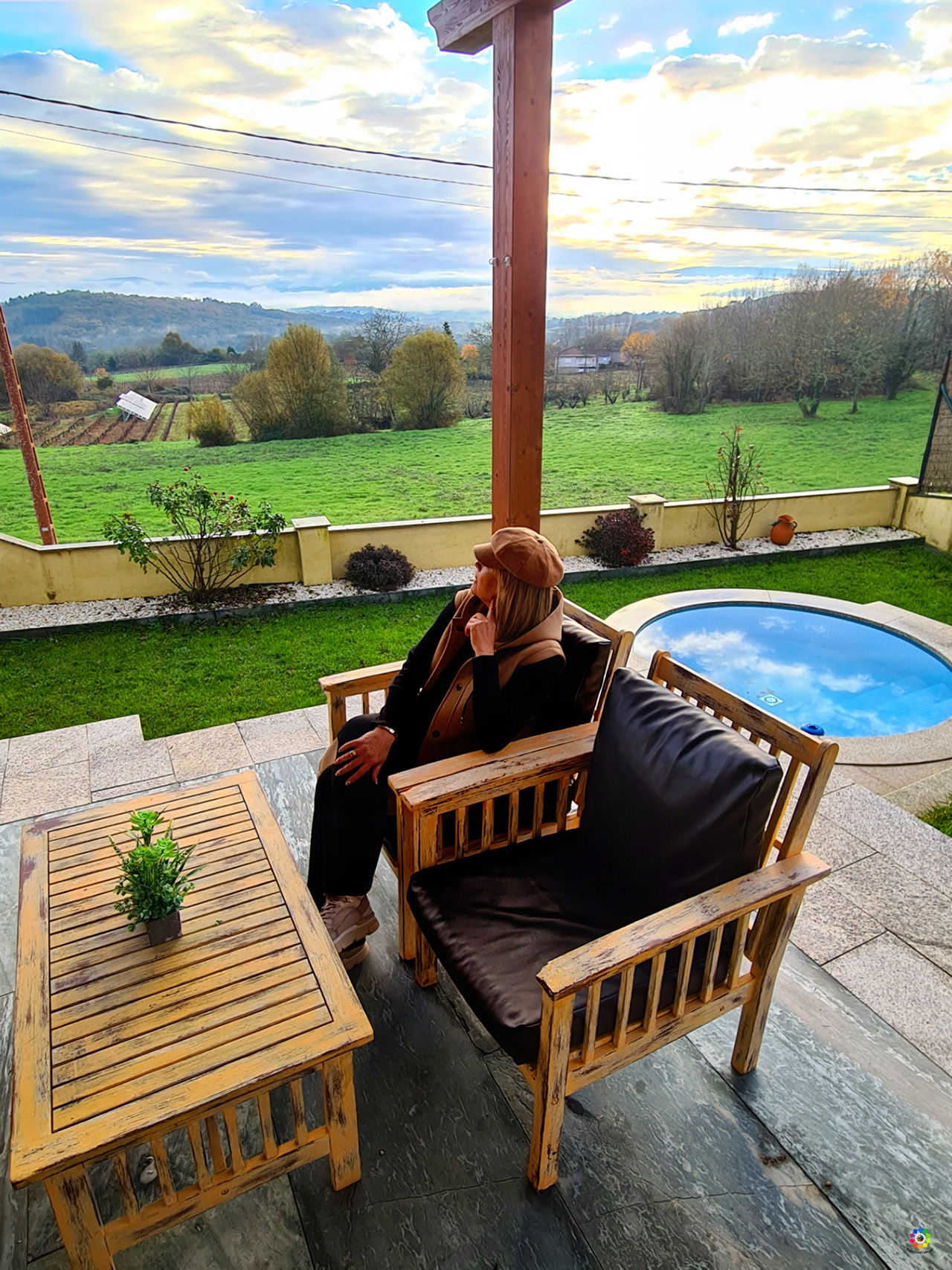 Aunque desde la terraza ( desde nuestra cabaña) apenas se ve un trocito de mar, por los árboles que estan delante, el entorno es precioso, una zona súper tranquila ideal para desconectar. Y muy cerca puedes disfrutar de una puesta de sol espectacular en Cabo Udra , hasta tienes un bar allí mismo para tomar algo, o pasear por las preciosas playas de la zona como la Playa Mourisca.