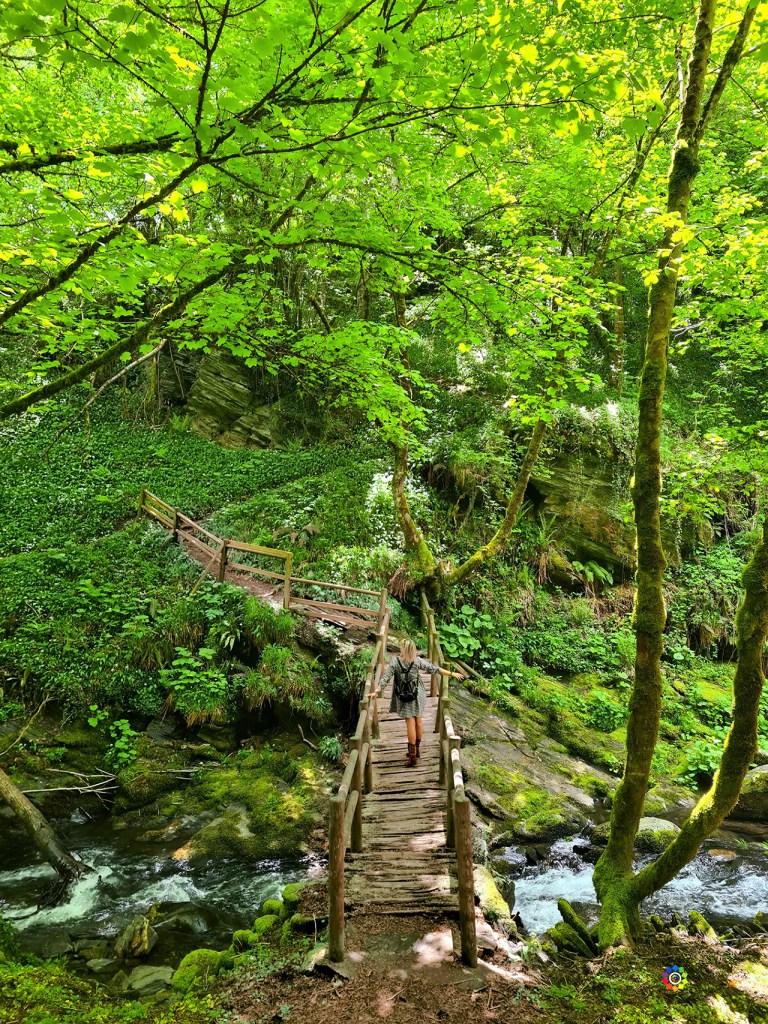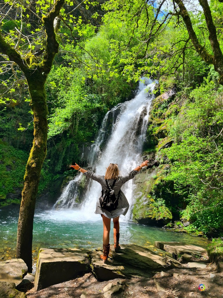 Y una vez hayas visitado el precioso pueblo de A Seara, nos vamos a una de las cascadas más bonitas que hemos visitado, en un entorno que parece sacado de un cuento , rodeada de una exuberante vegetación , esta preciosidad de cascada, de unos 25m de caída, forma una piscina natural de aguas turquesa espectacular. El agua continúa río a bajo formando saltos y pasando bajo un puente de madera casi camuflado con la vegetación.