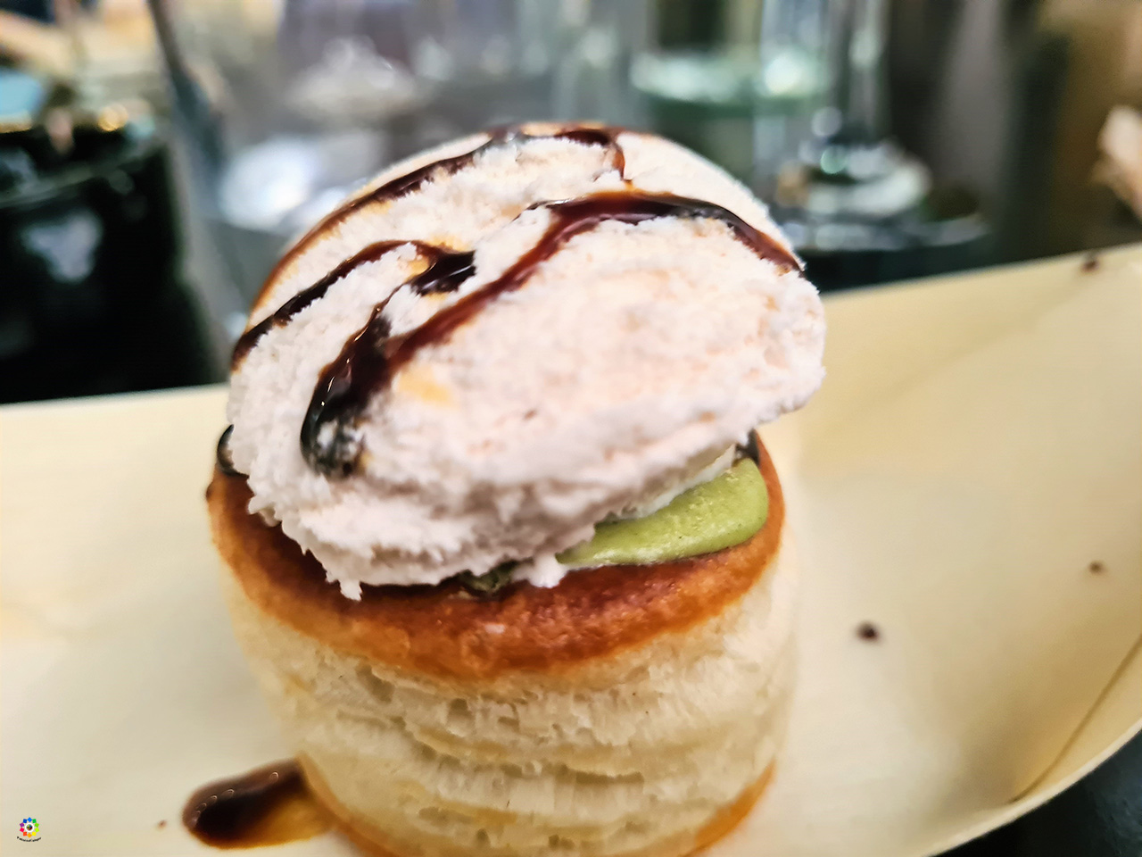 Volcán de tarta de queso y té verde matcha con helado de leche merengada