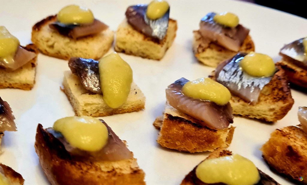Sardina ahumada sobre pan brioche y puré de aceituna verde