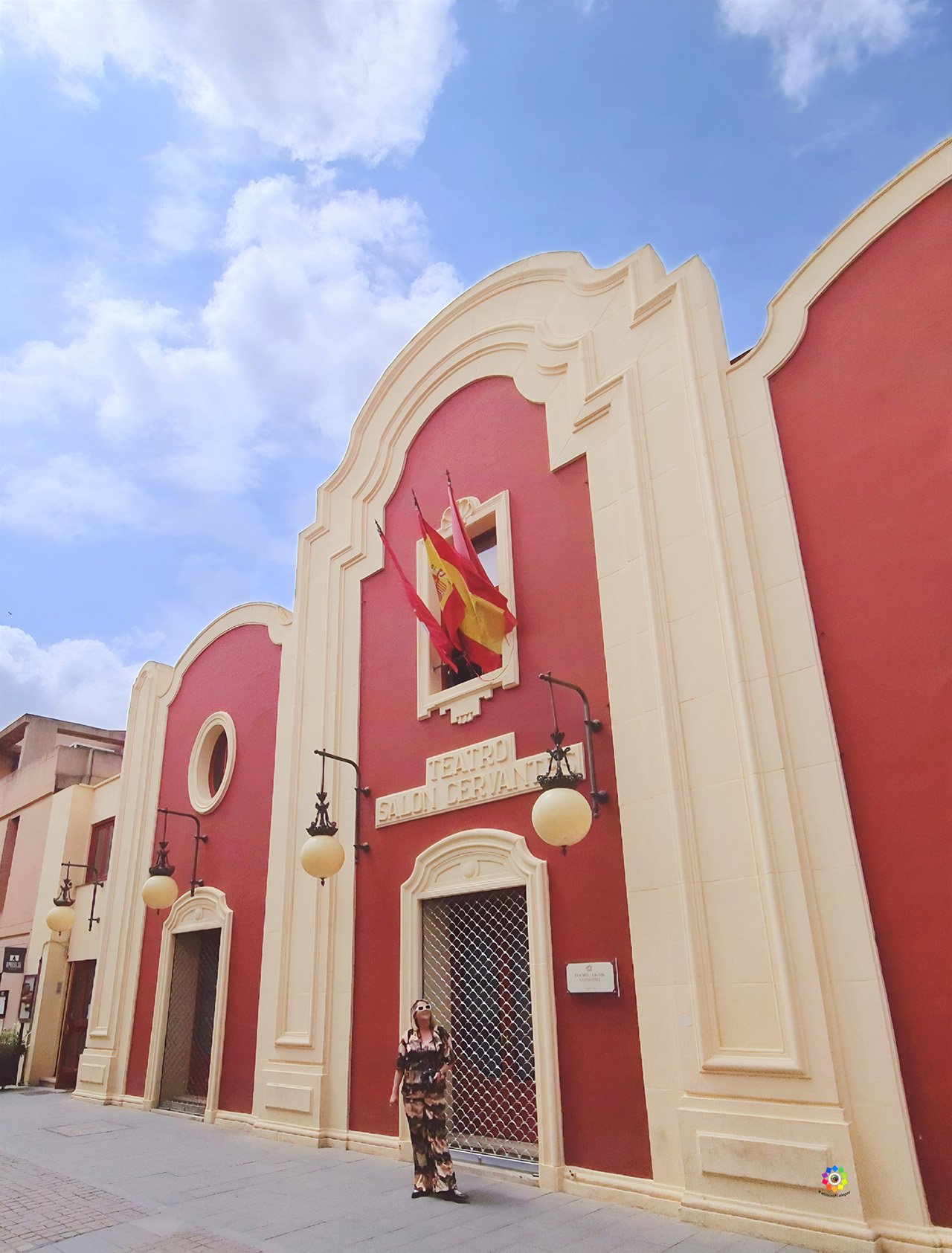 Continuamos por la Calle Mayor y giramos a la izquierda en la Calle de Cervantes, casi al final de la calle en la confluencia con la Calle de Santiago nos encontramos la colorida fachada del Teatro Cervantes.