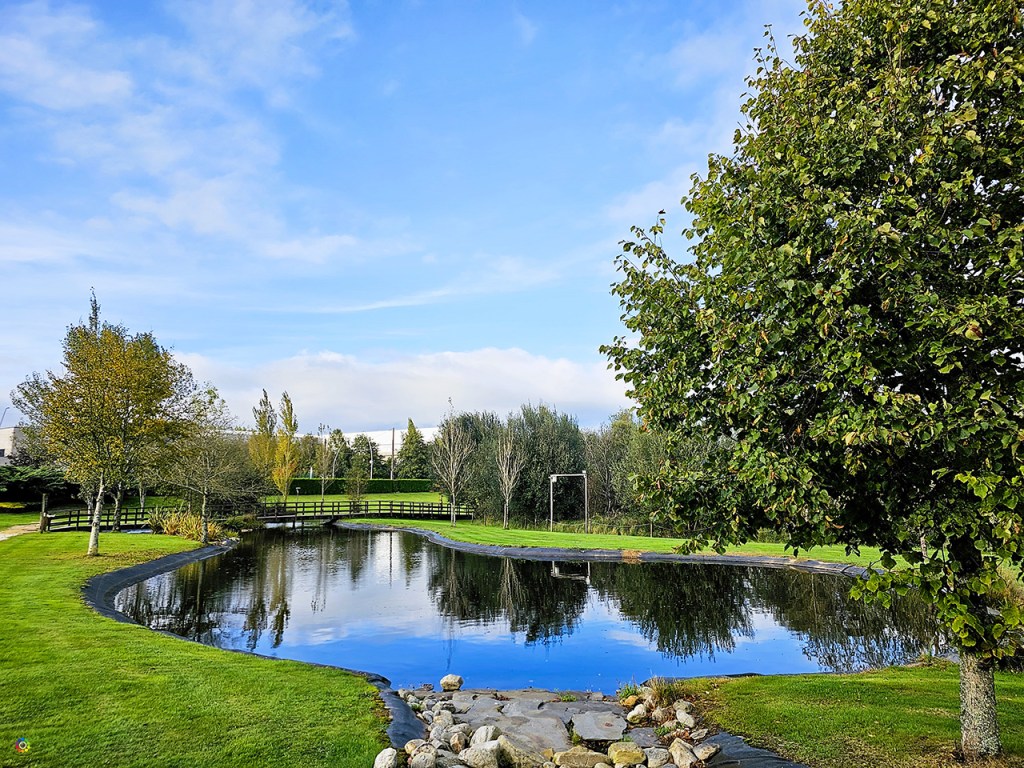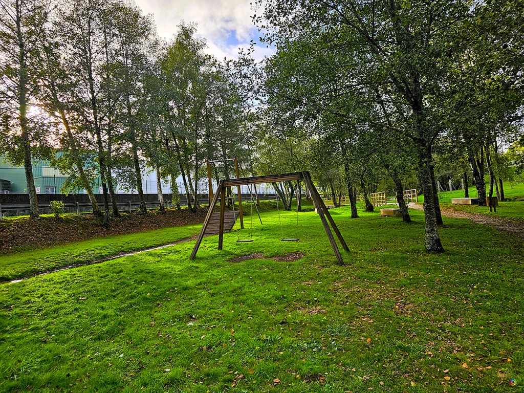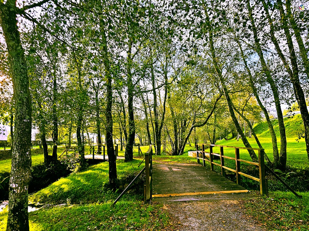 En uno de los lados de la carretera encontramos una bonita zona ajardinada, con lagunas , puentes de madera cruzando el río, una plataforma mirador de madera con vistas a la laguna, un jardín botánico , zona de merendero con mesas y bancos y hasta un aula de naturaleza. Cruzando la carretera, nos adentramos por un paseo mágico de puentes de madera que va sorteando el río y descubrimos la zona que hará que los peques de la familia se lo pasen en grande: un pequeño parque infantil perfectamente integrado en el entorno con mobiliario de madera en el que disfrutarán de columpios y hasta una tirolina.