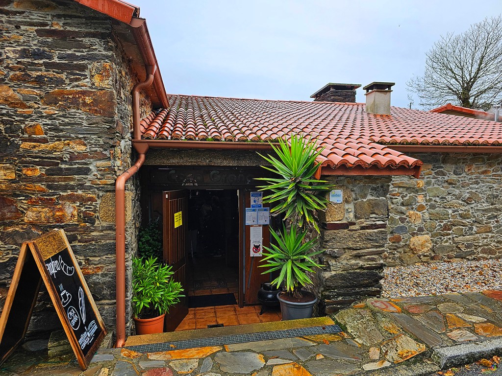 El restaurante ocupa una antigua casa familiar de casi un siglo, en épocas pasada fue hasta hospital de leprosos. Pero este lugar no es solo frecuentado por peregrinos ,aunque la mayor parte de su clientela lo sea por la ubicación en la que está. Aquí van vecinos y gente de muchos lugares atraídos por la fama de su cocina. El secreto de su éxito: recetas tradicionales elaboradas con el mejor producto y sin aditivos innecesarios, nada de especies ni salsas prefabricadas, ni siquiera olla expres, todo estilo casero como hacía nuestras abuelas y todo producto fresco, verduras de la cosecha de los vecinos de Bruma, carne de la carnicería de siempre…. Un menú sencillo que en verano ofrece caldo o ensalada de pasta de primero ( se sustituye en invierno por un plato de cuchara) , de segundo lacón o muslos de pollo y de postre natillas y arroz con leche casero elaborado a diario, yogurt , tarta helada o café. Los fines de semana siempre tienen callos y en invierno hacen las famosas filloas, no se si sabes que la filloa es un postre típico gallego, muy parecido al crepe . Pues aquí elaboran filloas pero no la dulce sino una receta tradicional que se hace con un ingrediente especial, el caldo. Lo encontrarás abierto desde antes de las nueve de la mañana para los desayunos hasta las diez de la noche, horario de cierre del albergue. Para reservar puedes llamar al teléfono: 981606006