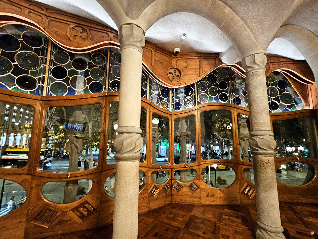 En la Sala Lluis Millet, dedicada al fundador del Orfeó Catalá, descubrimos unos impresionantes vitrales con motivos florales, que la cierran y dan paso a un excepcional balcón con doble columnata con una preciosa ornamentación y coloración.