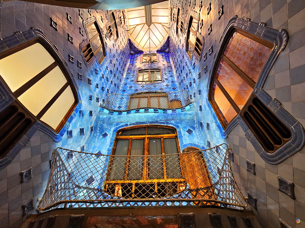Hierro forjado, madera, vidrieras, azulejos de cerámica, ornamentos de piedra, formas imposibles… Un viaje al mundo fantástico de Julio Verne con un Patio de Luces revestido de azulejos de distintos tonos azules, de más oscuros a más claros, para obtener la mejor distribución de la luz.