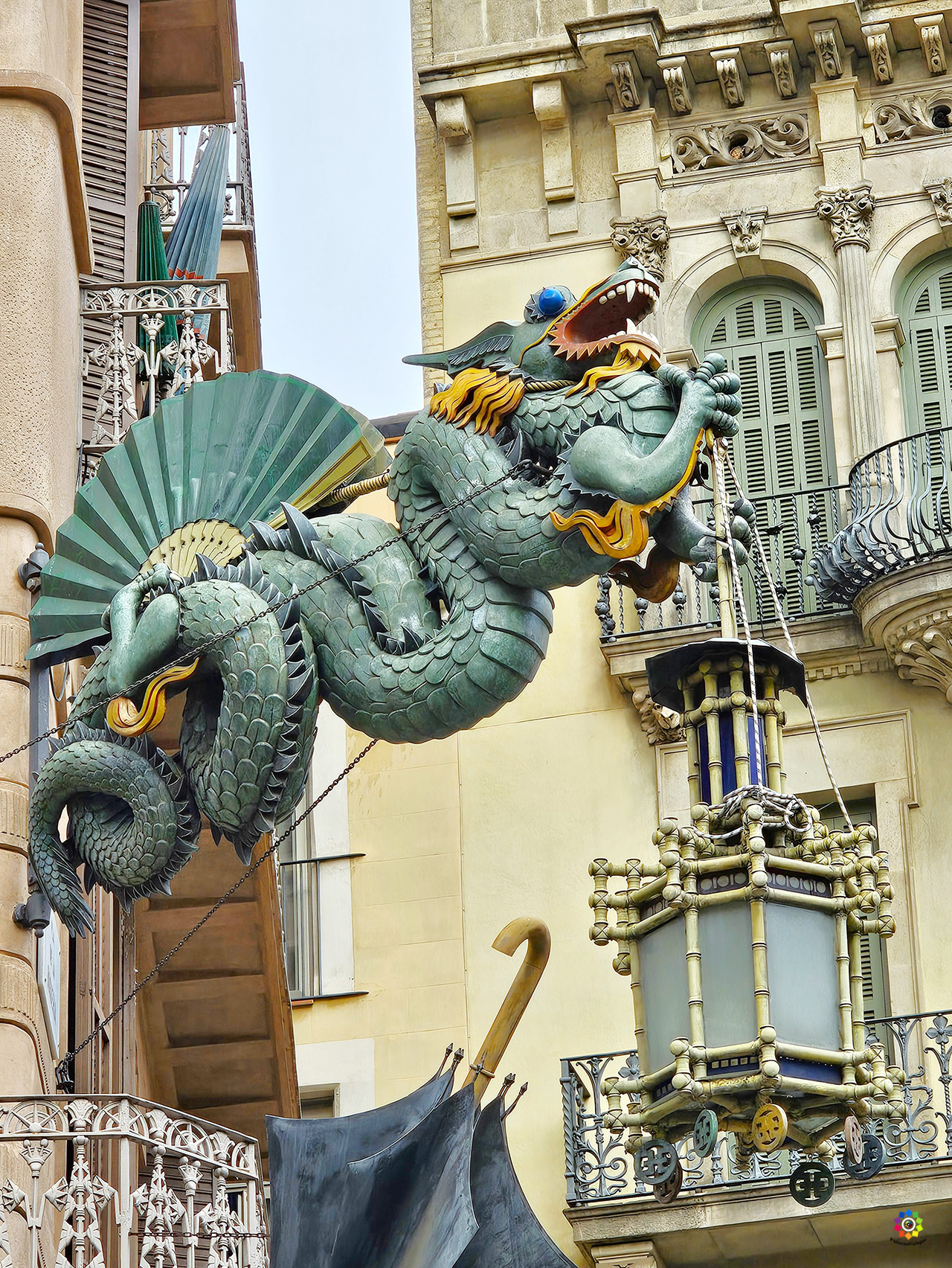 Te sorprenderás con la fachada de la Casa Bruno Cuadros, una alegoría del orientalismo que antiguamente fue una tienda de paraguas. Si paseas por las Ramblas, es imposible no verla, te dejará con la boca abierta. Los balcones y la galería del último piso están llenos de referencias egipcias. E l fachada, los esgrafiados y las vidrieras recuerdan sombrillas y abanicos de hierro fundido. Pero lo más llamativo, sin duda, es el gran dragón chino de hierro forjado que sobresale de la fachada y sostiene un paraguas como reclamo de la tienda. Después de las reformas de 1980, en el local de la tienda de paraguas, se ubicó una sucursal bancaria.