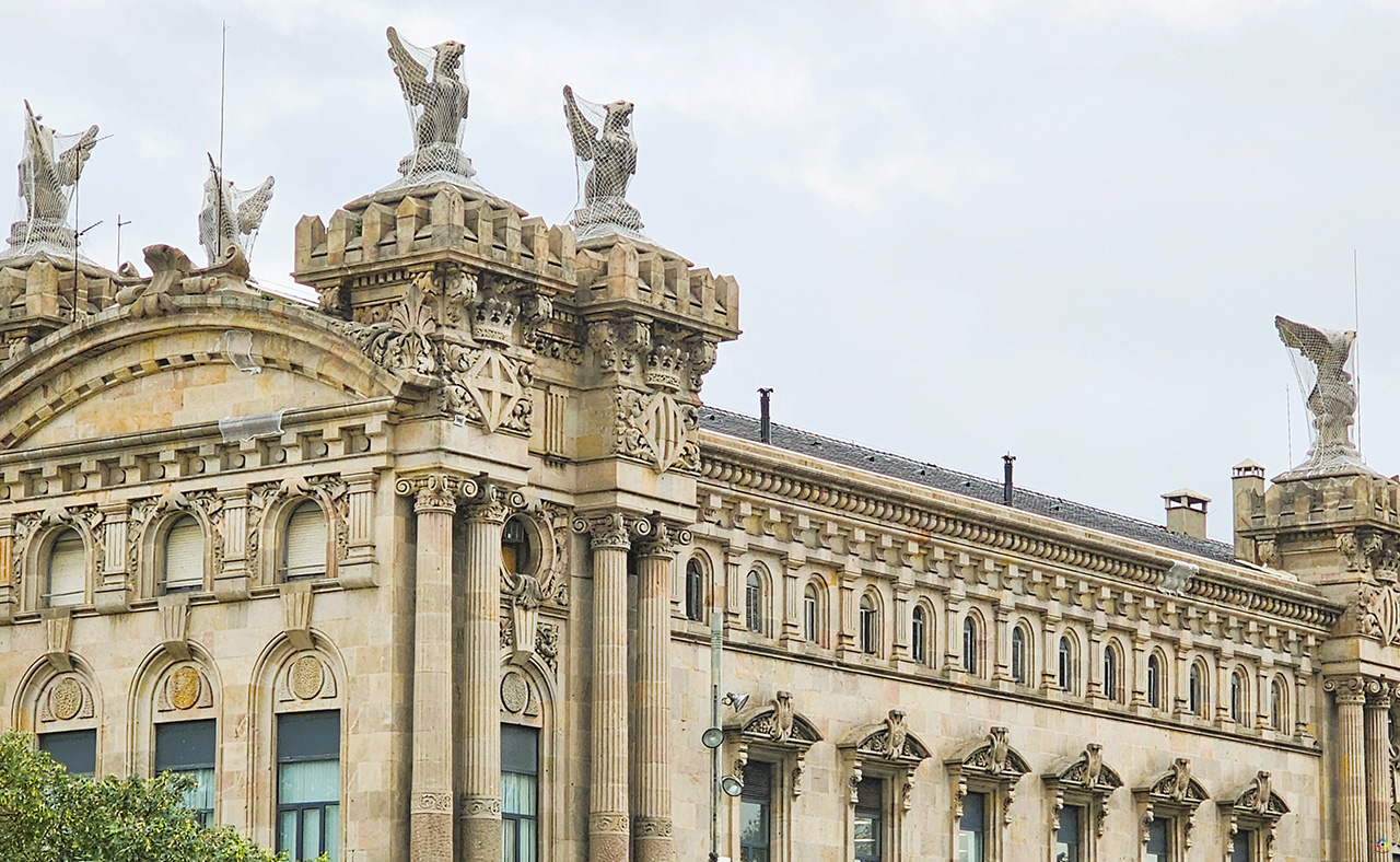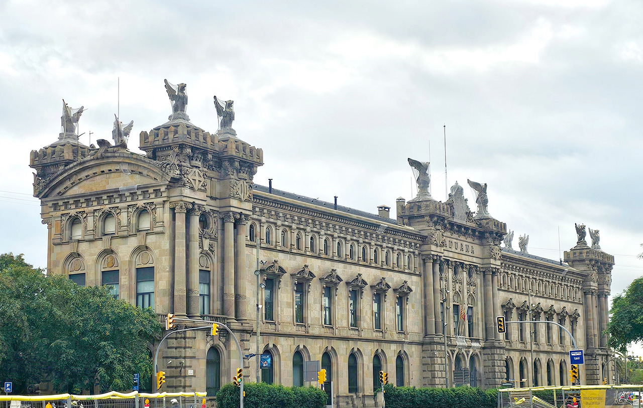 Casi llegando al Monumento de Colón, no podemos dejar de admirar el edificio de la Aduana del Puerto, construido entre 1896 y 1902 por el arquitecto Enric Sagnier i Villavecchia en colaboración con Pere Garcia Fária. Un edificio con planta en forma de H, en estilo ecléctico. Con una preciosa fachada monumental ornamentada con esculturas de ilustres y famosos escultores de la època, rematada en escudos de Barcelona, Cataluña y España y con dos águilas y ocho leones alados, obra de Eusebi Arnau.