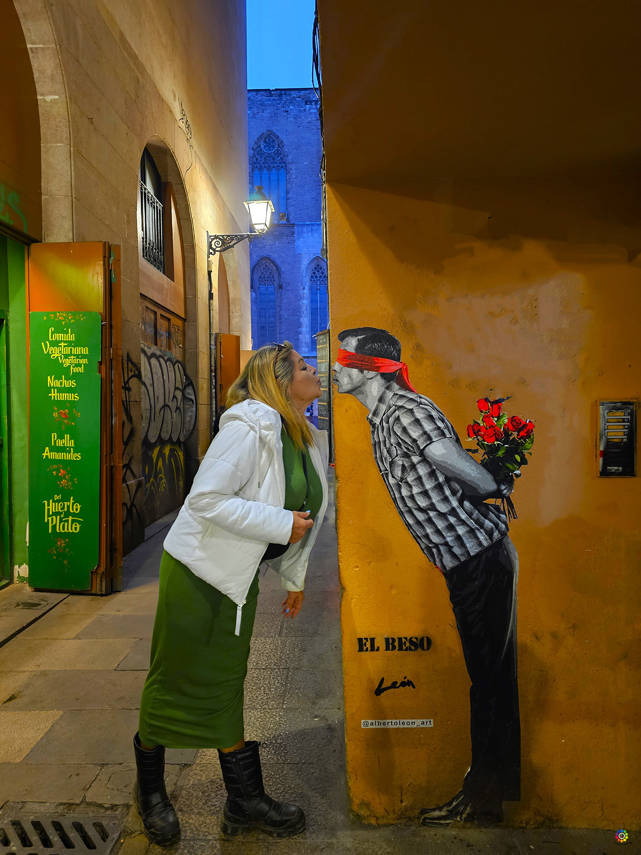 Camino a la Basílica, en el corazón del barrio de El Born, nos encontramos otra muestra de street art, en esta ocasión, una obra de Alberto León, titulada «El beso» , una de esas fotos que no puede faltar en tus redes sociales. Está justo en el callejón que da acceso a El Fossar de les Moreres.