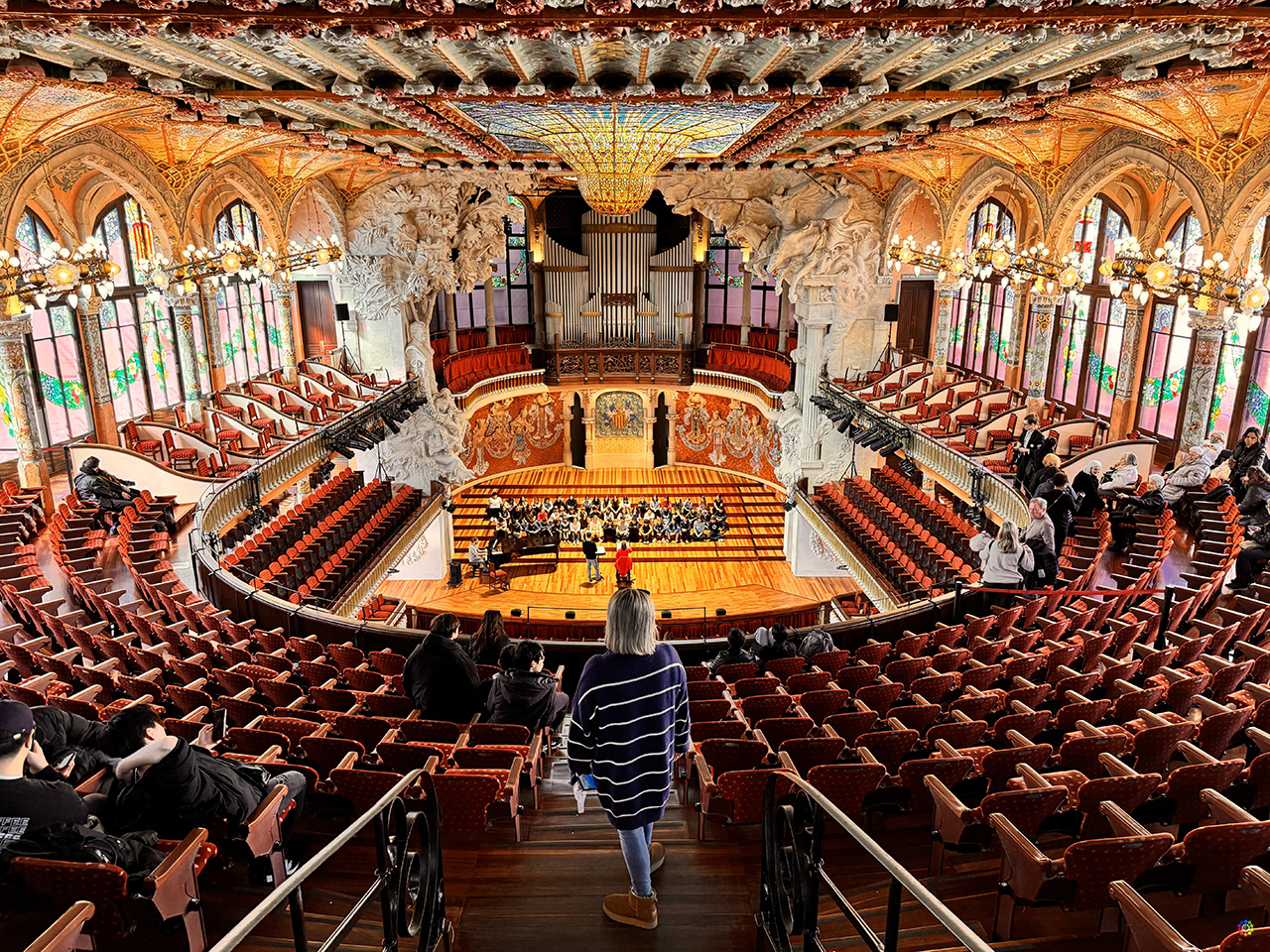 Después de admirar su espectacular fachada, descubrimos en su interior la única sala de conciertos declara Patrimonio de la Humanidad por la UNESCO, en 1997. Presidida por el órgano y un lucernario central que representa el sol. El escenario está rodeado de musas, las valquirias de Wagner surgen del techo y a ambos lados se encuentran los bustos de Anselm Clavé y Beethoven , flores , palmeras y frutas , decoran un espacio increíblemente bello.