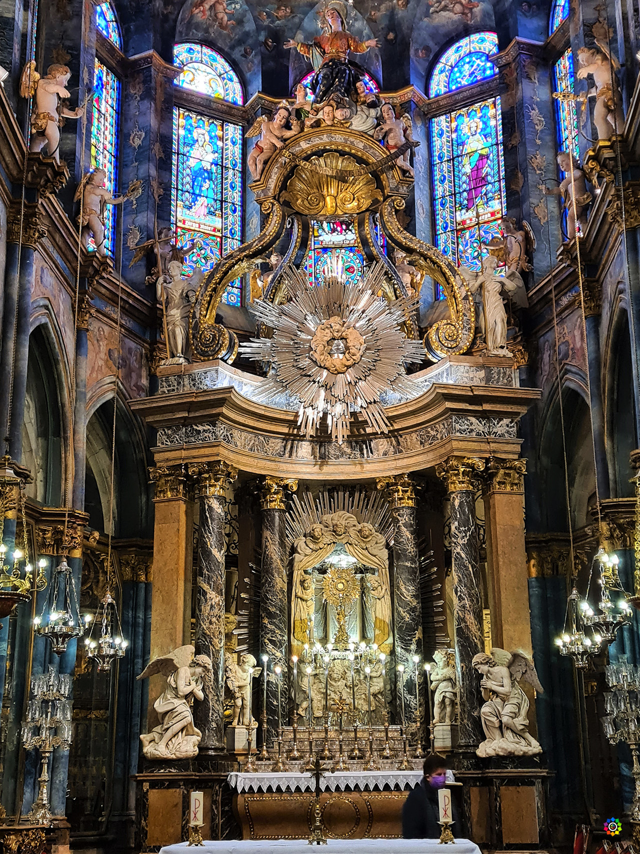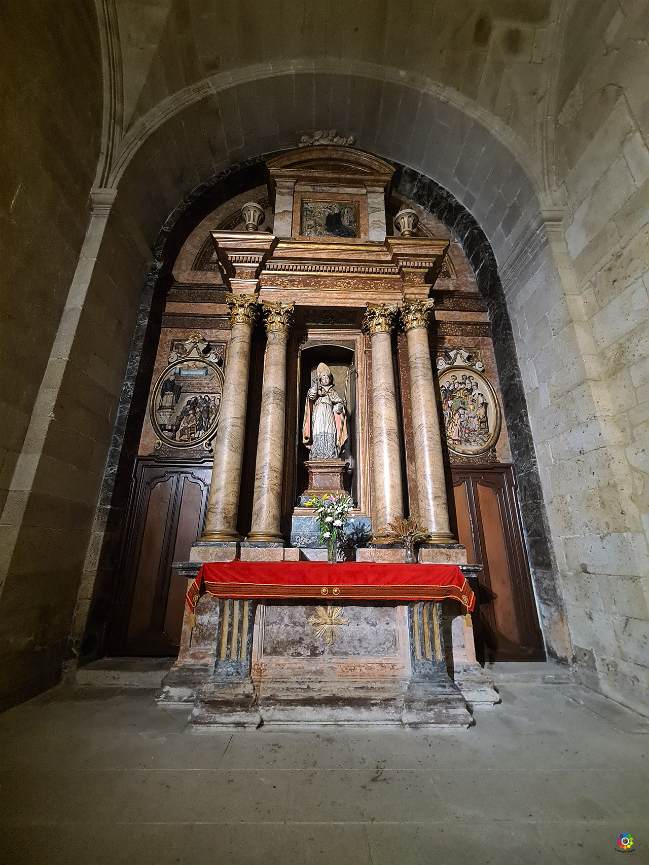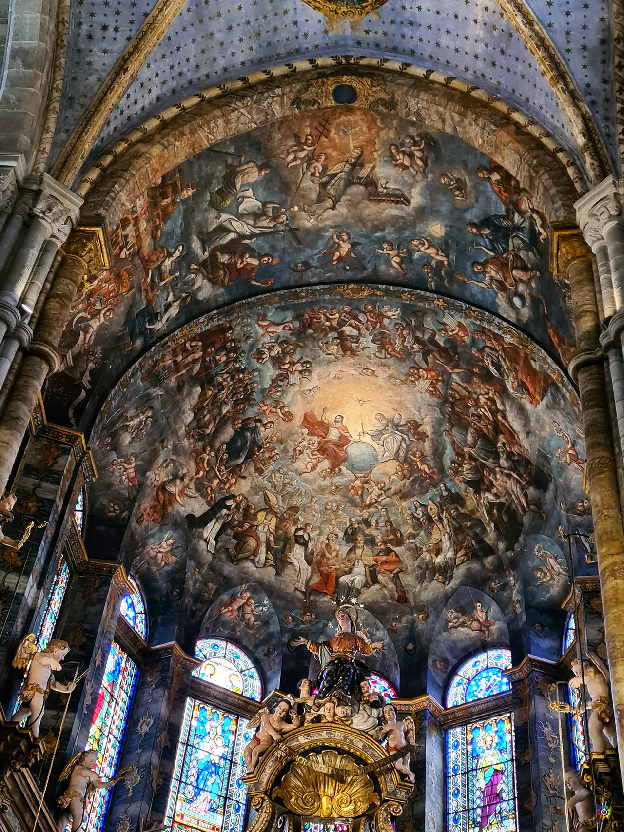 En la Capilla Mayor se expone desde la segunda mitad el siglo XVIII de la Eucaristía . Para esta exposición permanente cuenta con un privilegio papal y por este motivo una de las denominaciones de la ciudad de Lugo es » La ciudad del Sacramento». La custodia en la que permanentemente se expone el Santísimo fue regalada en 1772 por Don Juan Sáenz de Buruaga, que había sido Obispo de Lugo y ostentaba en ese momento el cargo de Arzobispo de Zaragoza. Fíjate en las pinturas de la bóveda, podrás contemplar la vida del cielo que contiene la Eucaristía. Esta decoración realizada entre 1766 y 1768 conforma un conjunto espectacular que algunos definen como la «Capilla Sixtina» del barroco gallego. Aquí estaba , antes de ser desmontado a causa del terremoto de Lisboa de 1755, el retablo de Cornelius de Holanda.