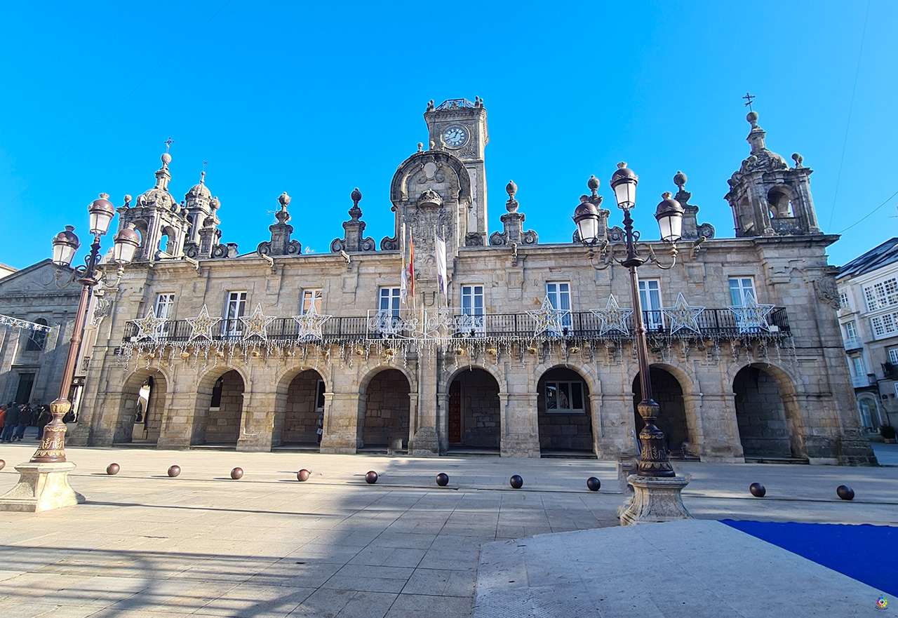 Uno de los puntos destacados es el Ayuntamiento, un majestuoso edificio construido en 1738 en estilo barroco, diseñado por Ferro Caaveiro y coronado por dos imponentes torres con los escudos de la ciudad. La torre del reloj se añadió más tarde, en 1871. El Ayuntamiento preside la plaza, hecho de la sólida piedra de cantería y con un porche que invita a explorar su interior. En 1914, se retiró la fuente original para dar paso a hermosos jardines, donde ahora se encuentra una escultura emblemática de España y cuatro leones flanqueando la entrada.