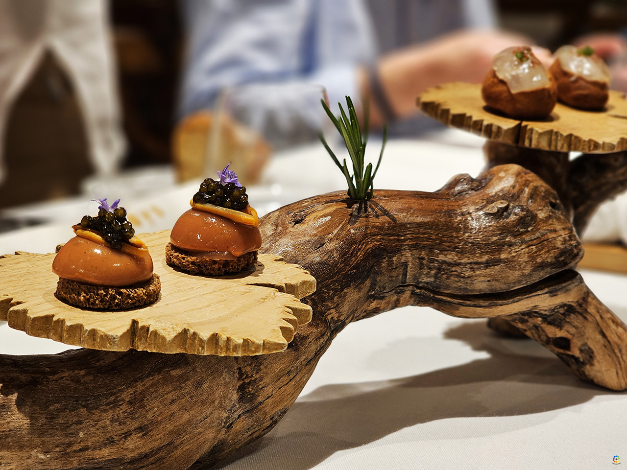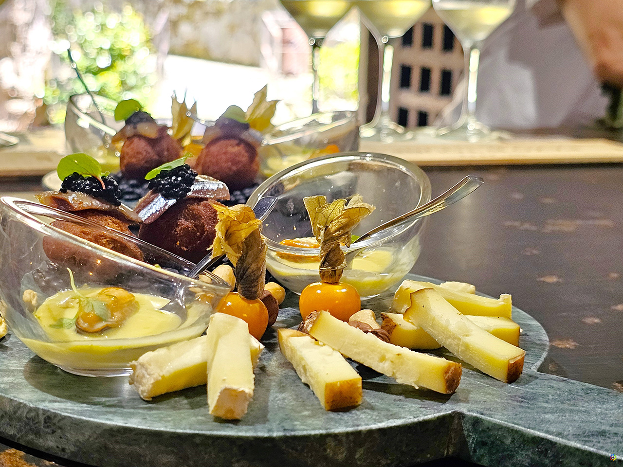 El local es realmente precioso, en una ubicación de lujo, con vistas a los viñedos y un atardecer de cine para disfrutar con uno de los cócteles que te preparan antes de la cena. En nuestro caso, saboreamos un exquisito menú degustación compuesto por:
