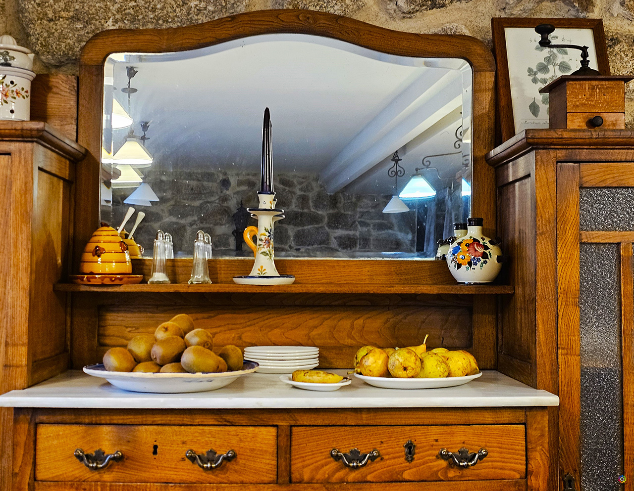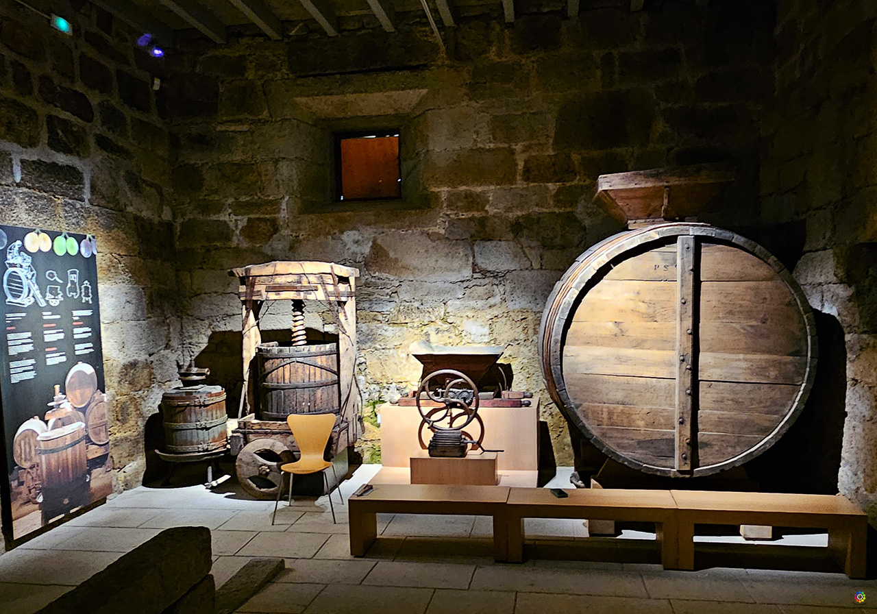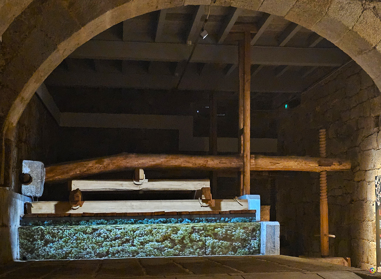 Tenemos que destacar el impresionante lagar que alberga. En la visita al lagar podrás disfrutar de una proyección fascinante, que no te vamos a desvelar, pero que estamos seguros de que te dejará sin palabras. La antigua rectoral de Santo André albergaba cinco lagares, dos de los cuales han sido reconstruidos. Estas prensas de gran tamaño se utilizaban con un sistema de palanca y contrapeso para la elaboración del vino. Los lagares consistían en un depósito de piedra donde se depositaba la uva, sobre el cual se montaba la prensa. La presión se ejercía mediante una viga conectada a un contrapeso de piedra. Una vez montada la estructura, los productores hacían girar el contrapeso, haciendo que la viga descendiera y exprimiera las uvas. El zumo resultante se canalizaba hacia otro tanque pétreo, facilitando el proceso de obtención del vino.