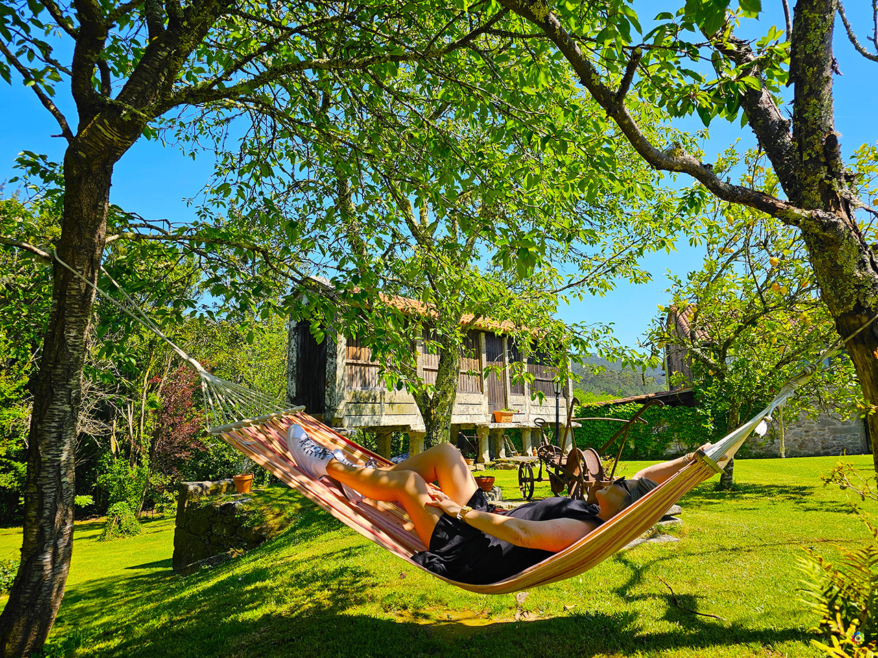 En el exterior, una amplia zona ajardinada, con parking privado dentro de la finca, una pequeña terraza en la fachada de la casa, un hórreo y una hamaca en los árboles y en la parte posterior una terraza más amplia , cubierta con mesa grande y un asador enorme. También tiene una estupenda piscina. No se alquila por habitaciones, solo la casa completa. Reservas y más información aquí.