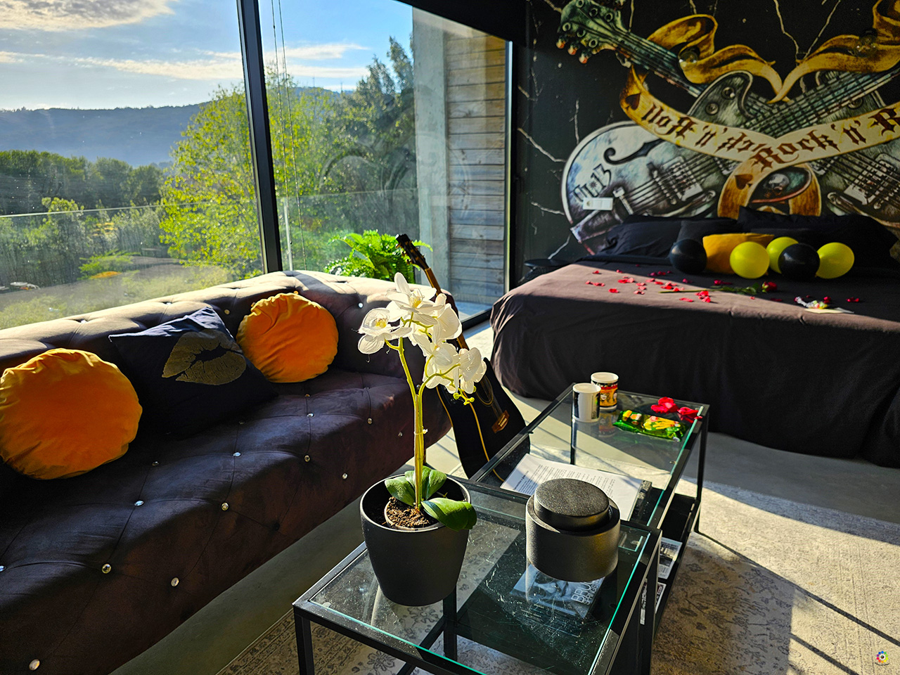 Ubicado muy cerca de la Playa de Broña, aquí te encontrarás varias suites decoradas con temáticas diferentes. Nosotros estuvimos alojados en la Rock Cube , decorada en esa temática ( con guitarra incluida y decoración preciosa con pétalos, globos y la música sonando cuando llegamos) y la experiencia fue fantástica. Una habitación muy amplia y luminosa , rodeada por grandes ventanales de cristal y una estupenda terraza , en un entorno natural super tranquilo y con el mar de fondo, cuando estuvimos nosotros hacía muy buen tiempo y dormir con el ventanal abierto, notando la brisa entrar y sin ningún ruido es un auténtico lujo. En el interior, un baño, ducha ( con albornoces) , aseo con detalles como una plancha de pelo, cocina , y el dormitorio con una parte de sala de estar. En la terraza un fantástico jacuzzi y un espacio para disfrutar del estupendo desayuno que te sirven en la habitación ( hay que solicitarlo aparte) y que incluye: café, leche, zumo, tostadas, frutas variadas, bollería, yogur, bebibles de yogur, cacao…. vamos que no le falta de nada!