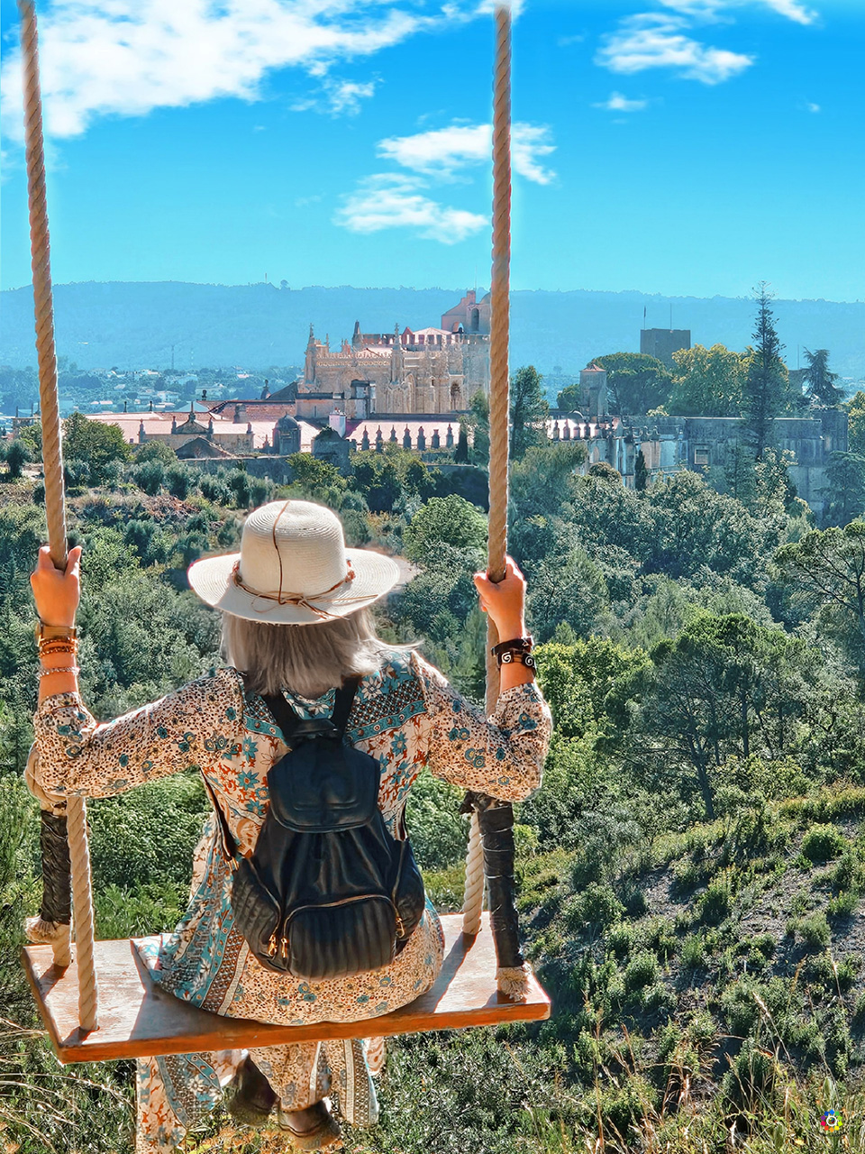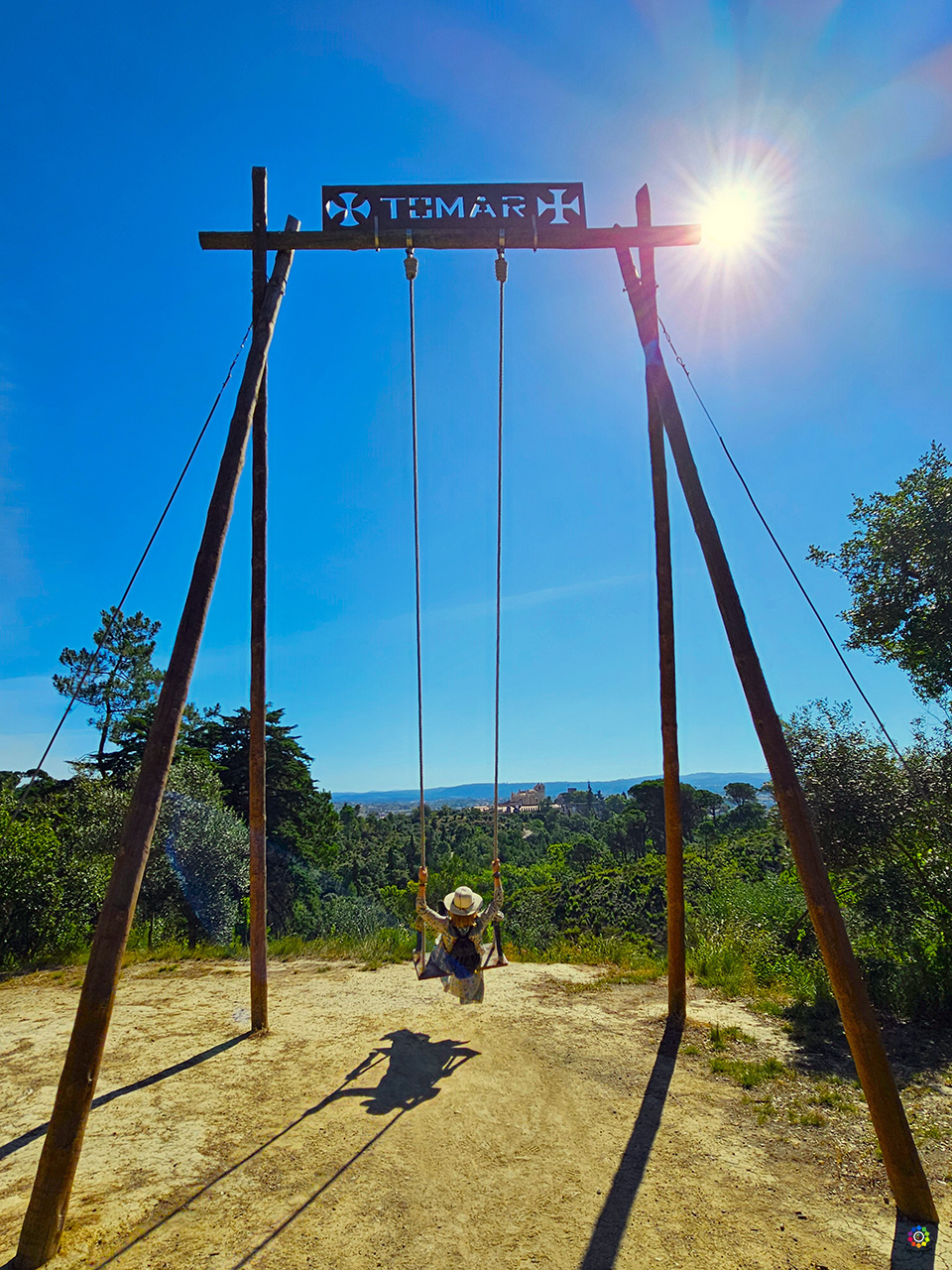 Para los amantes de las vistas panorámicas, recomiendo subir hasta la parte alta de la colina. Aunque el ascenso requiere una buena caminata, las abundantes zonas de sombra hacen que incluso en verano sea una experiencia agradable ( te recomiendo ir por la mañana a primera hora, especialmente en verano) Arriba te espera un espectacular columpio con vistas directas al Castillo de Tomar y al Convento de Cristo, un lugar perfecto para relajarse, disfrutar del paisaje y hacer unas fotazas.