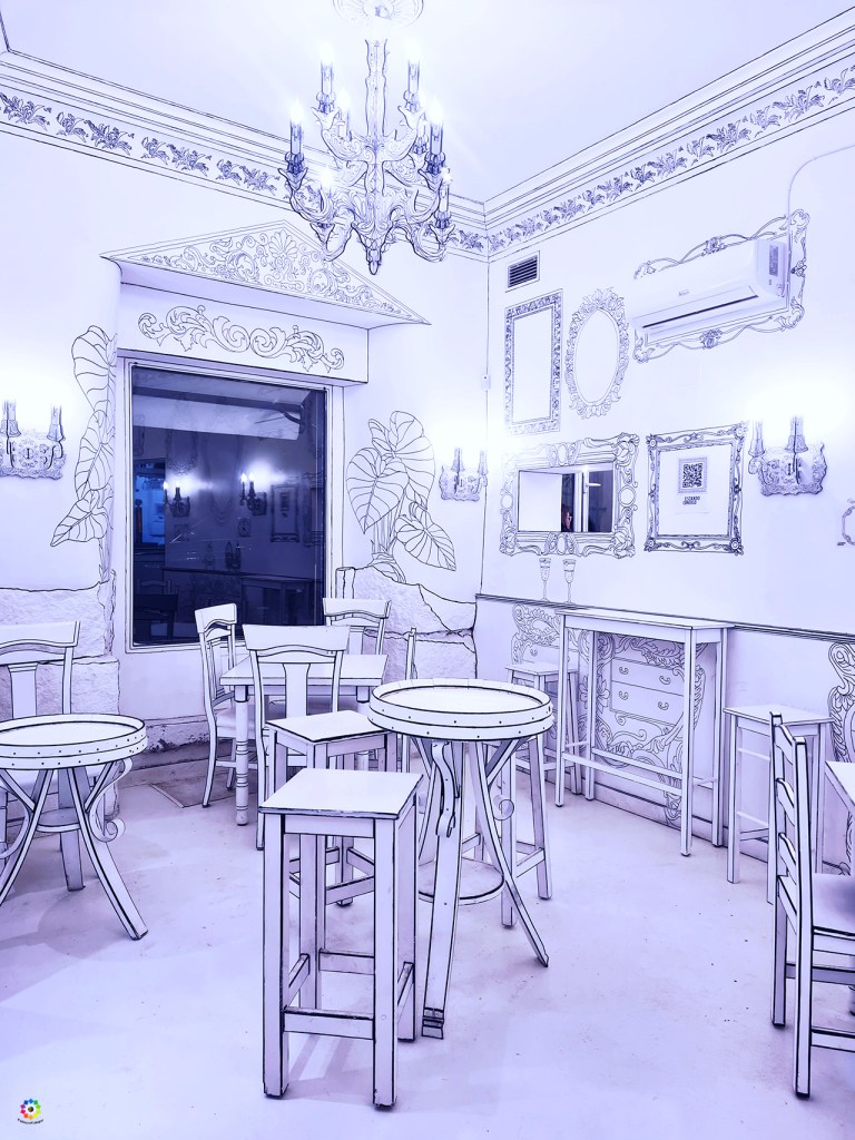 Ya desde la calle llama la atención la imagen a través de los cristales y es que su decoración te hará sentir como si fueses el protagonista de un cómic. Un local lleno de luz en el que predomina el blanco y sutiles líneas negras a modo de dibujo y en el que además te atenderán de maravilla.
