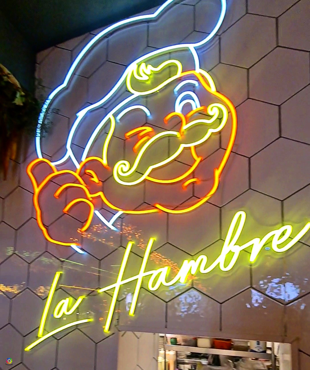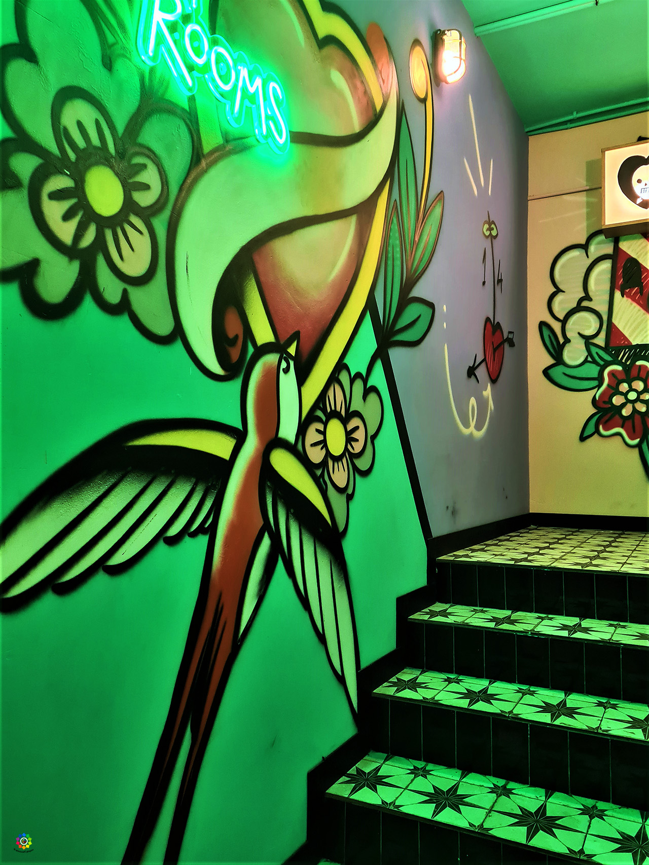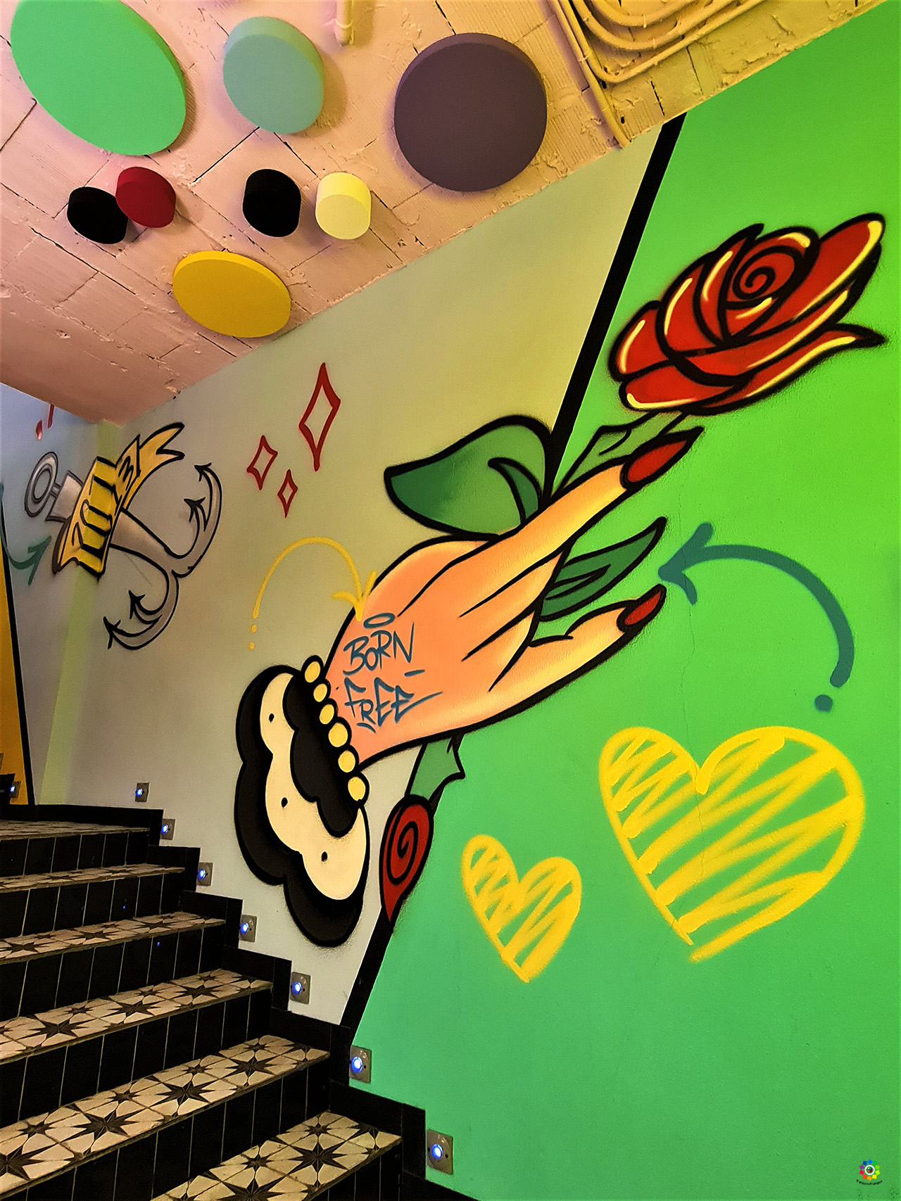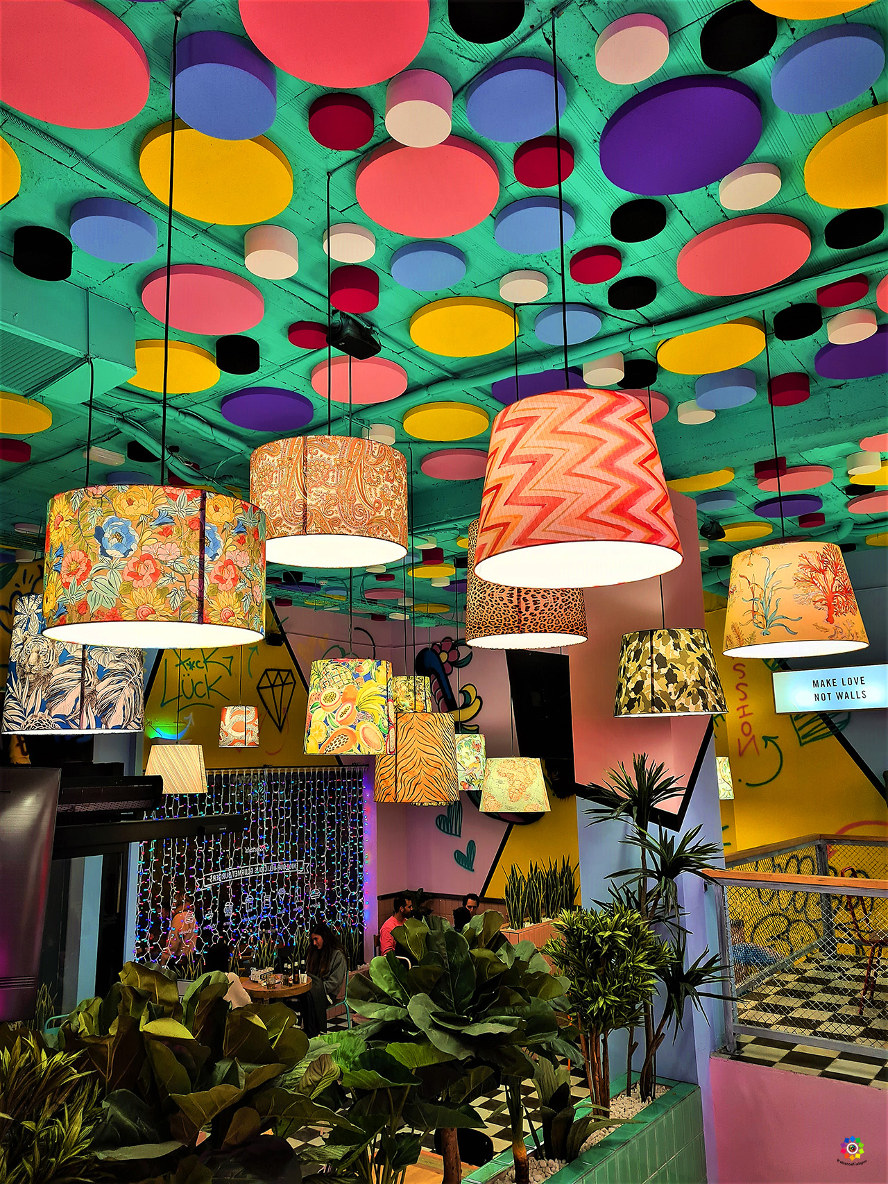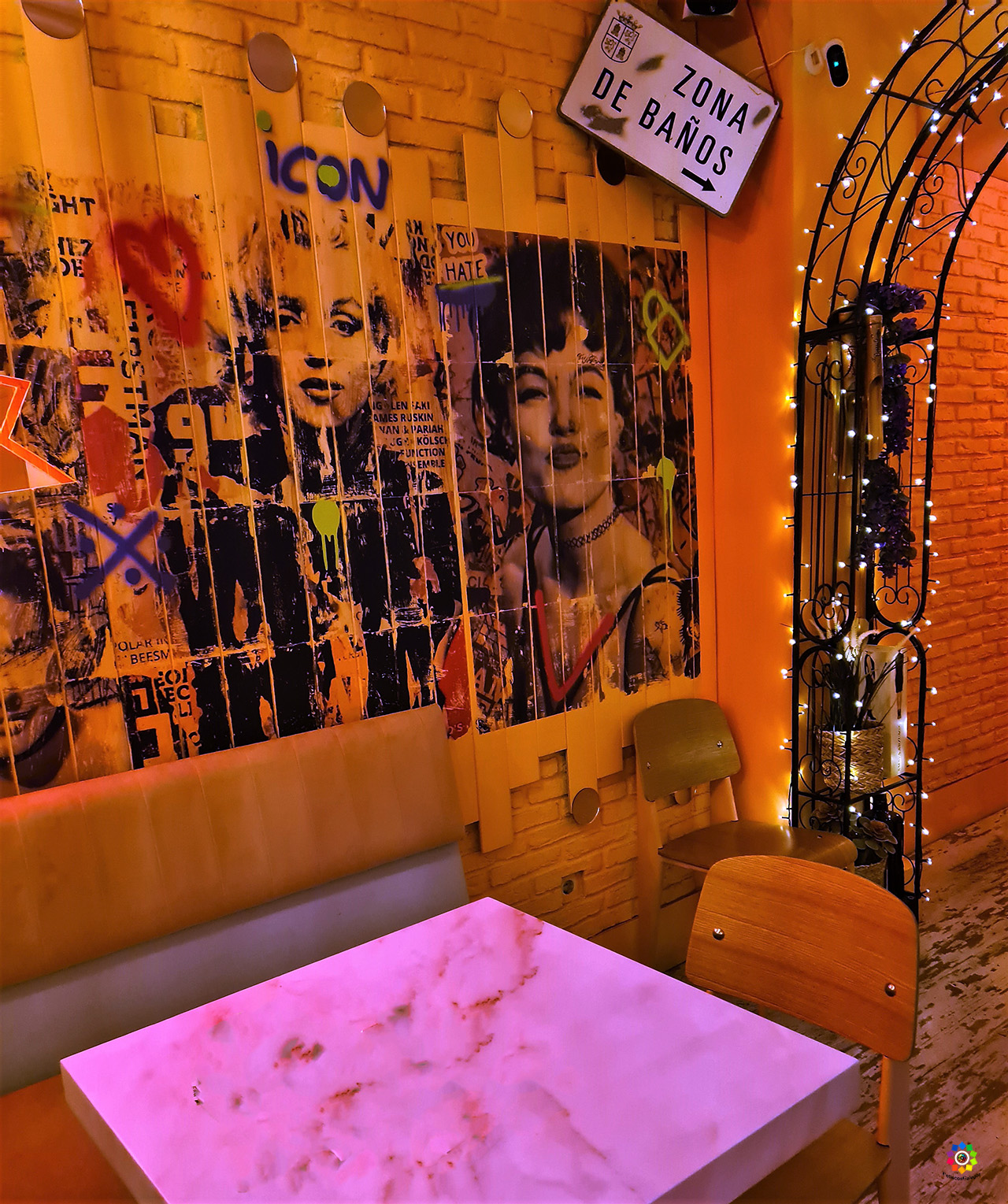 La decoración es todo un espectáculo de color, paredes que son auténticas obras de arte con grafitis hasta en el acceso a los baños. Carteles luminosos y rincones increibles . Todo esto y más te lo encontrarás aqui. Un local muy espacioso con varias zonas , una en la entrada, otra en la que se hacen los pedidos en la parte superior y otra más amplia en la planta inferior.