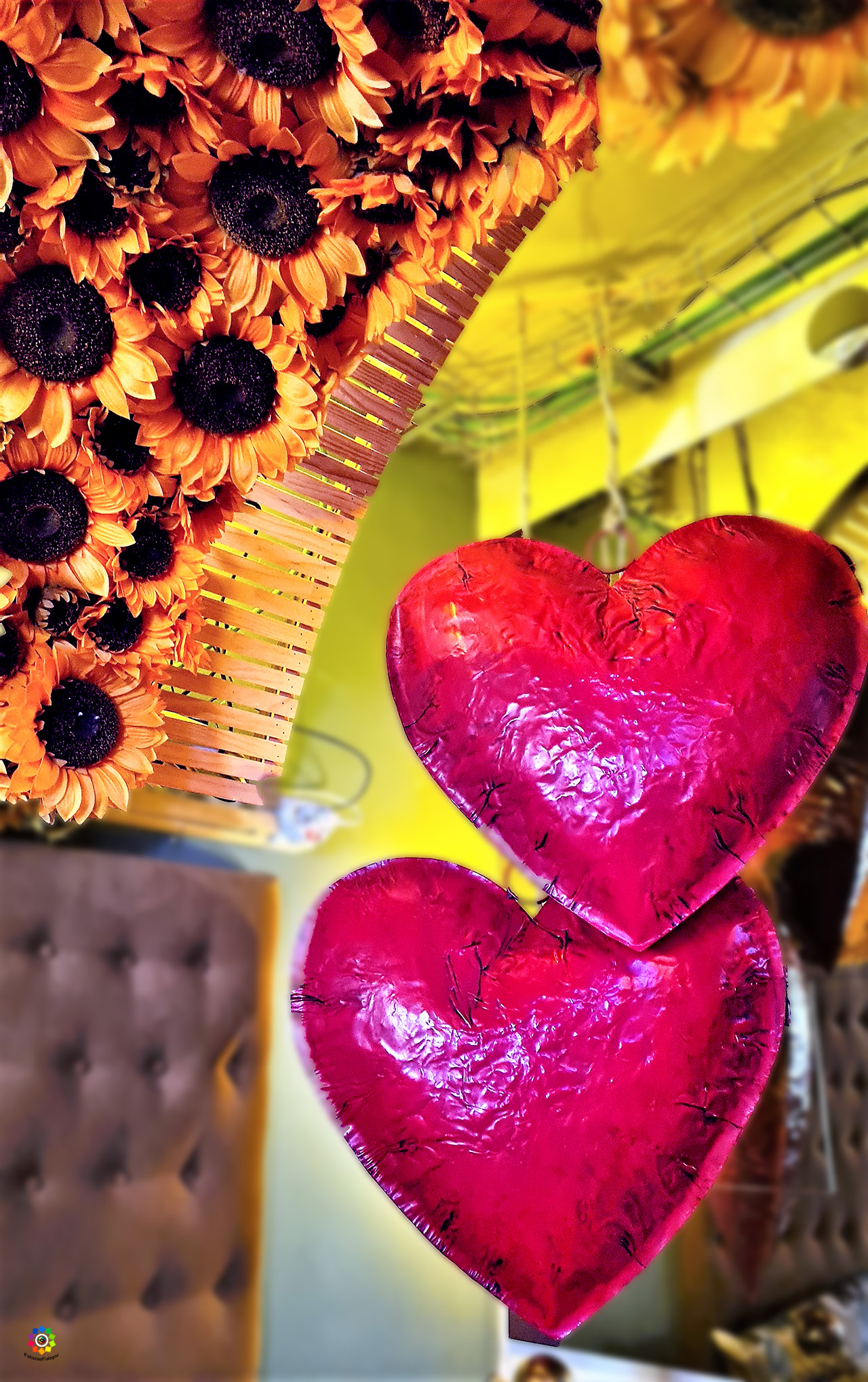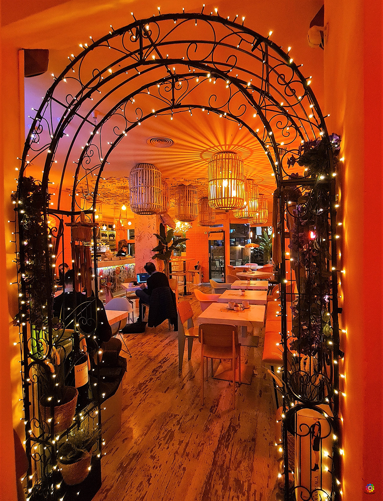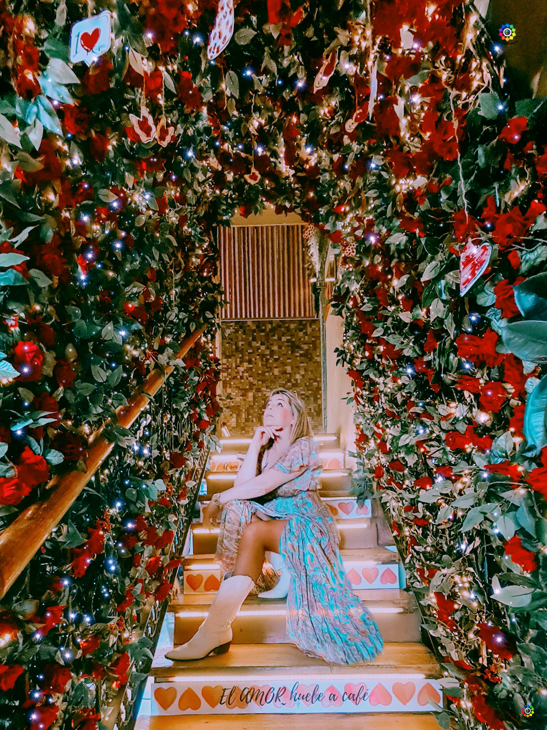 La decoración es super bonita, os llamará la atención nada más ver su exterior con motivos vegetales y luces. En el interior continúan los motivos vegetales, plantas , flores , luces … y la reina del local… la escalera a la planta superior convertida en un túnel de rosas y luces que es maravillosa. En la planta superior también hay rincones muy especiales , nada mas subir a la derecha, además de encontrarte alguna mesa en la ventana , hay un rinconcito super cuqui con dos enormes corazones rojos y con el techo cubierto de girasoles.