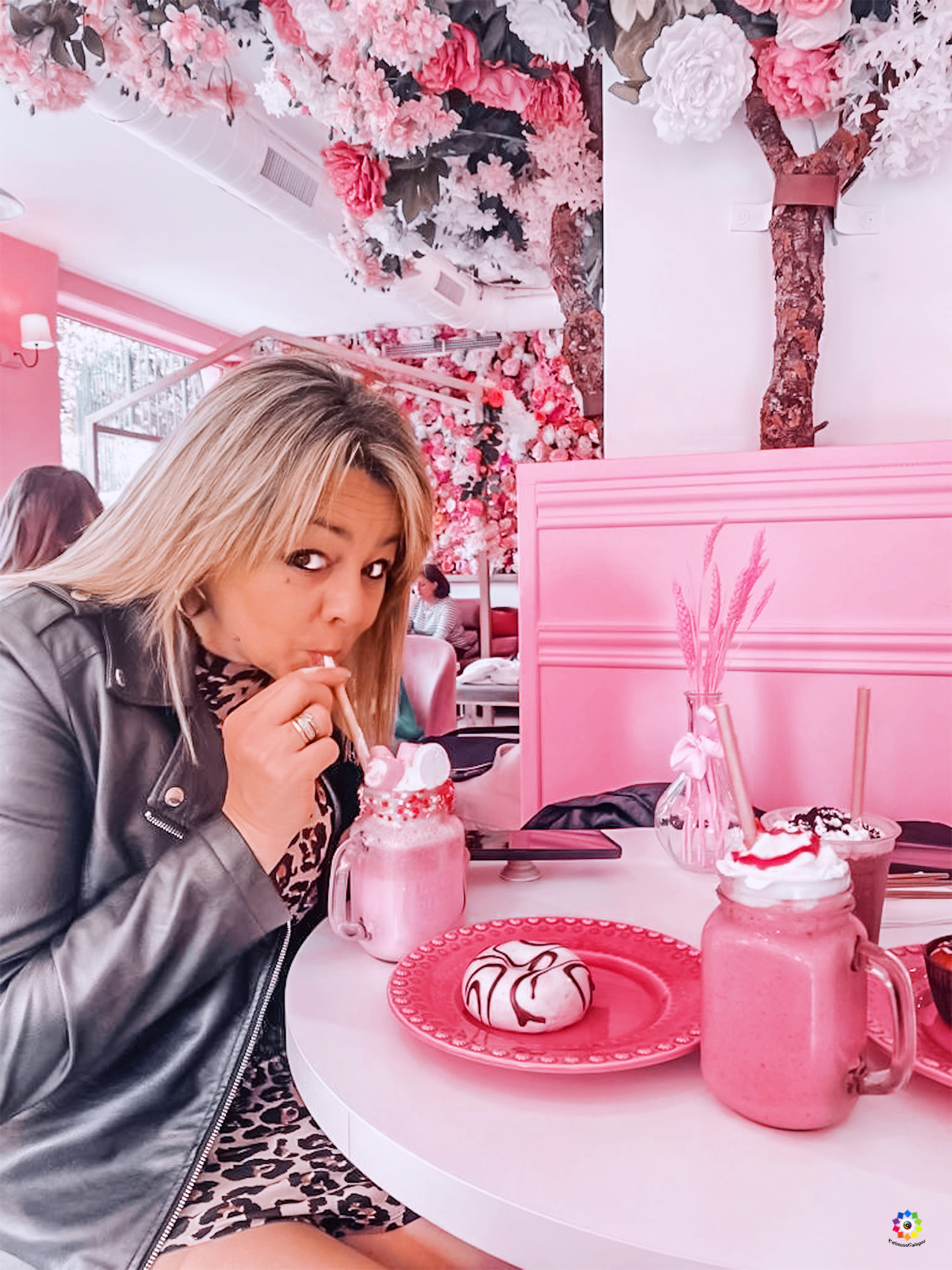 El local más rosa de todo Madrid! Una fantasía de cafetería/pastelería decorada toda en tonos rosa y muchísimas flores. Destaca una cabina telefónica , por supuesto, también rosa llena de flores que se ha convertido en el rincón más fotografiado del local junto con el rincón opuesto que tiene la pared literalmente cubierta de flores.
