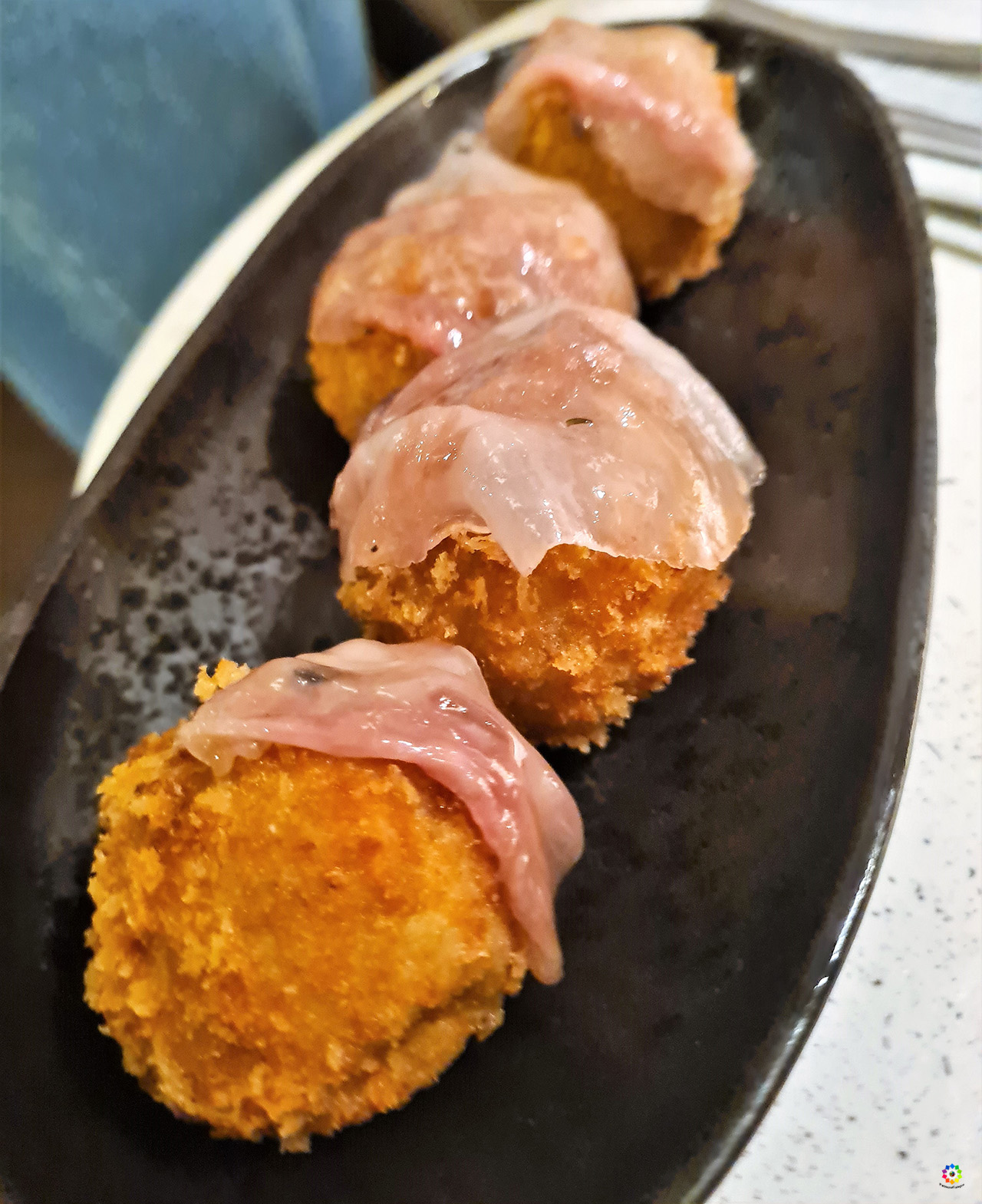 – Croqueta di Patate : Croqueta de tortilla de patata con cebolla y belo de papada ibérica