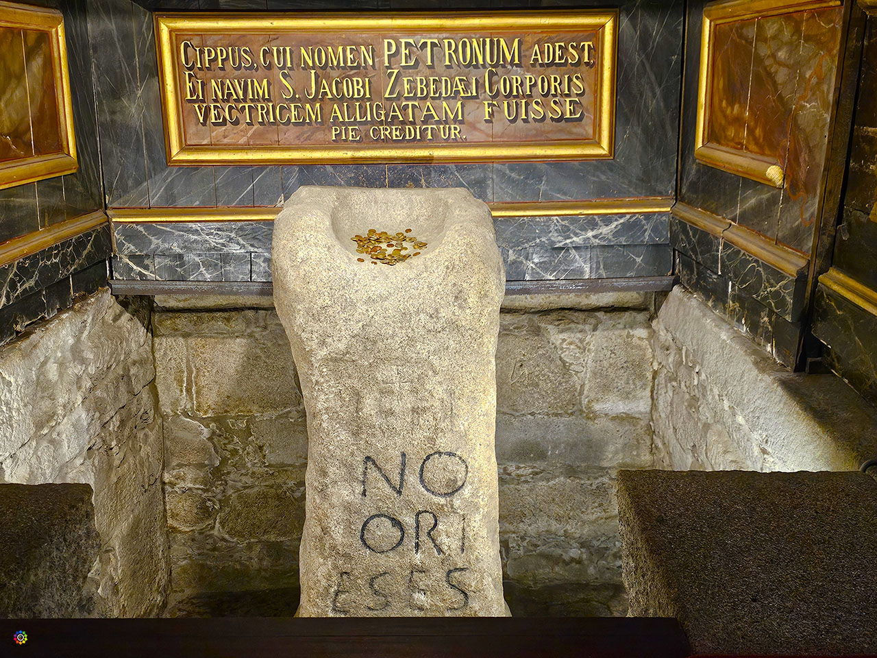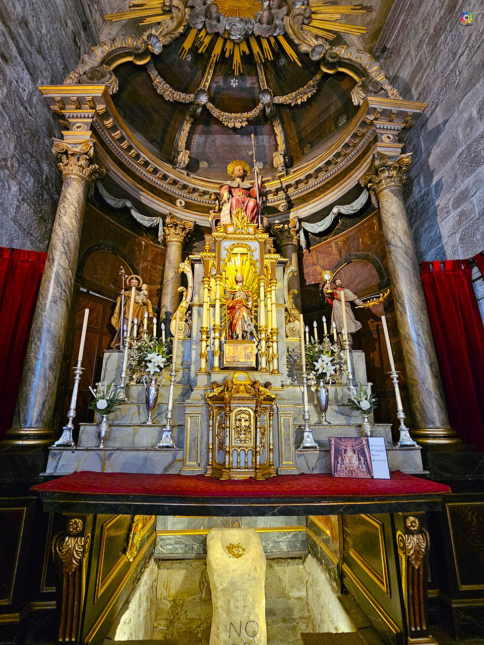 Lo que hace única a esta iglesia no es solo su arquitectura neoclásica o su legado medieval, sino el Pedrón, una piedra con un significado profundo para la tradición jacobea. Bajo su altar mayor se encuentra este ara romana dedicada originalmente a Neptuno, que con el paso del tiempo fue reinterpretada por el cristianismo como el punto donde, según la leyenda, los discípulos Teodoro y Atanasio amarraron la barca que trajo el cuerpo del Apóstol desde Palestina. De este símbolo proviene el nombre de la villa, Padrón, y es el eje en torno al cual gira la historia de este templo y su estrecha relación con la translatio, el traslado del Apóstol a tierras gallegas.