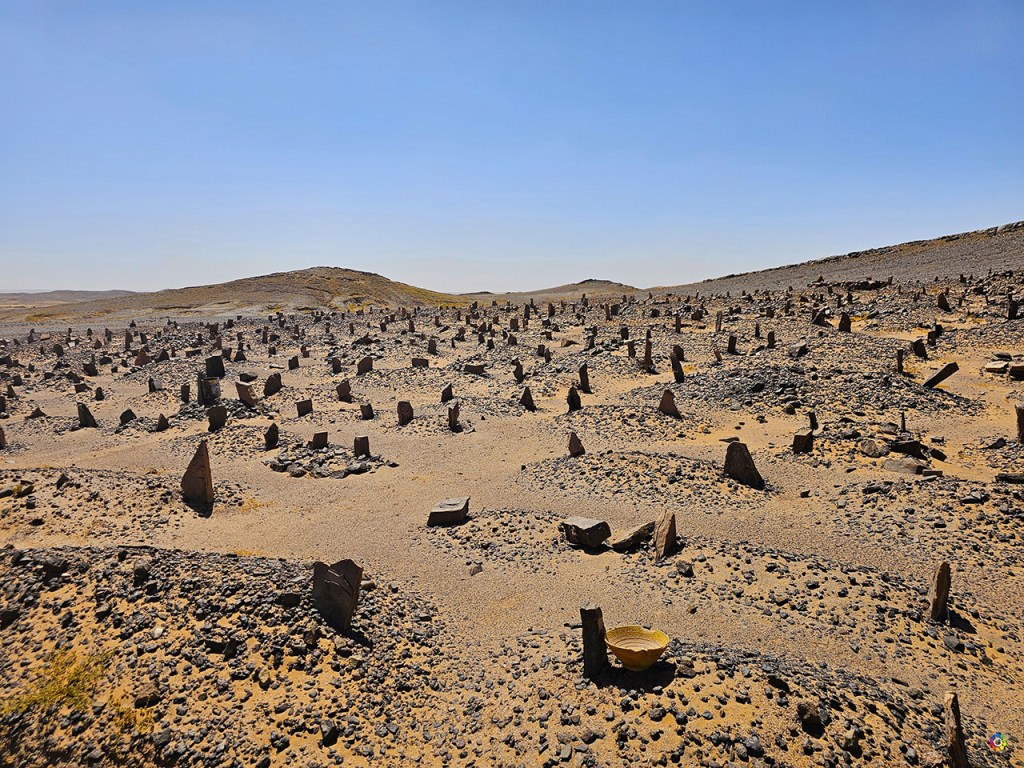 Otra de las sorpresas de esta excursión fue descubrir un antiguo cementerio beréber en el desierto, muy cerca de la mina de Khol. Estos cementerios tienen unas características especiales. Orientación hacia la Meca, sin lápidas en las que se distinga el nombre ni nada que identifique a la persona que allí yace. El motivo era que de esa forma todos los difuntos recibían oraciones porque los que visitaban a un familiar, con el paso del tiempo y el aumento de las tumbas acababan por no saber exactamente donde estaba y entonces la visita y la oración era para todos. La única distinción es la de hombres y mujeres . Las tumbas, humildes montículos de tierra, con dos pequeñas losas en sus extremos. Las de las mujeres tienen las losas una en frente a la otra y las de los hombres ligeramente giradas. En algunas de las tumbas se puede ver un cuenco que se colocaban en lugar de las habituales flores de otras culturas. En ellos la gente que pasa deposita agua para que beban los animales que pasan por allí como una forma de darles más vida.