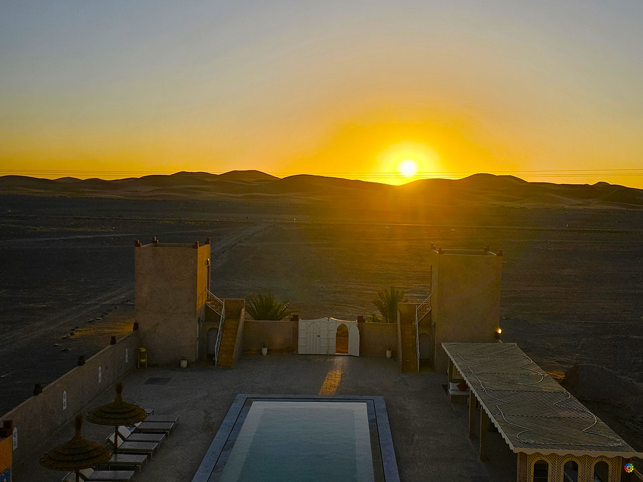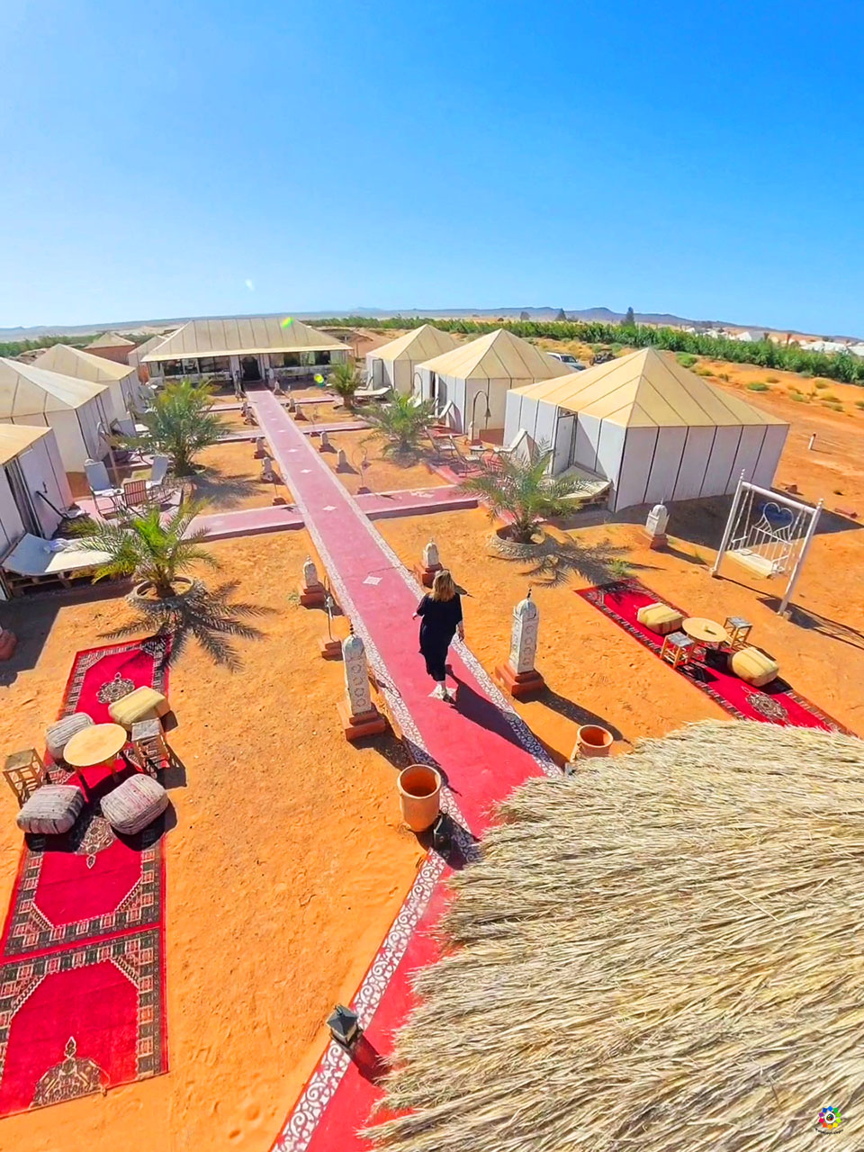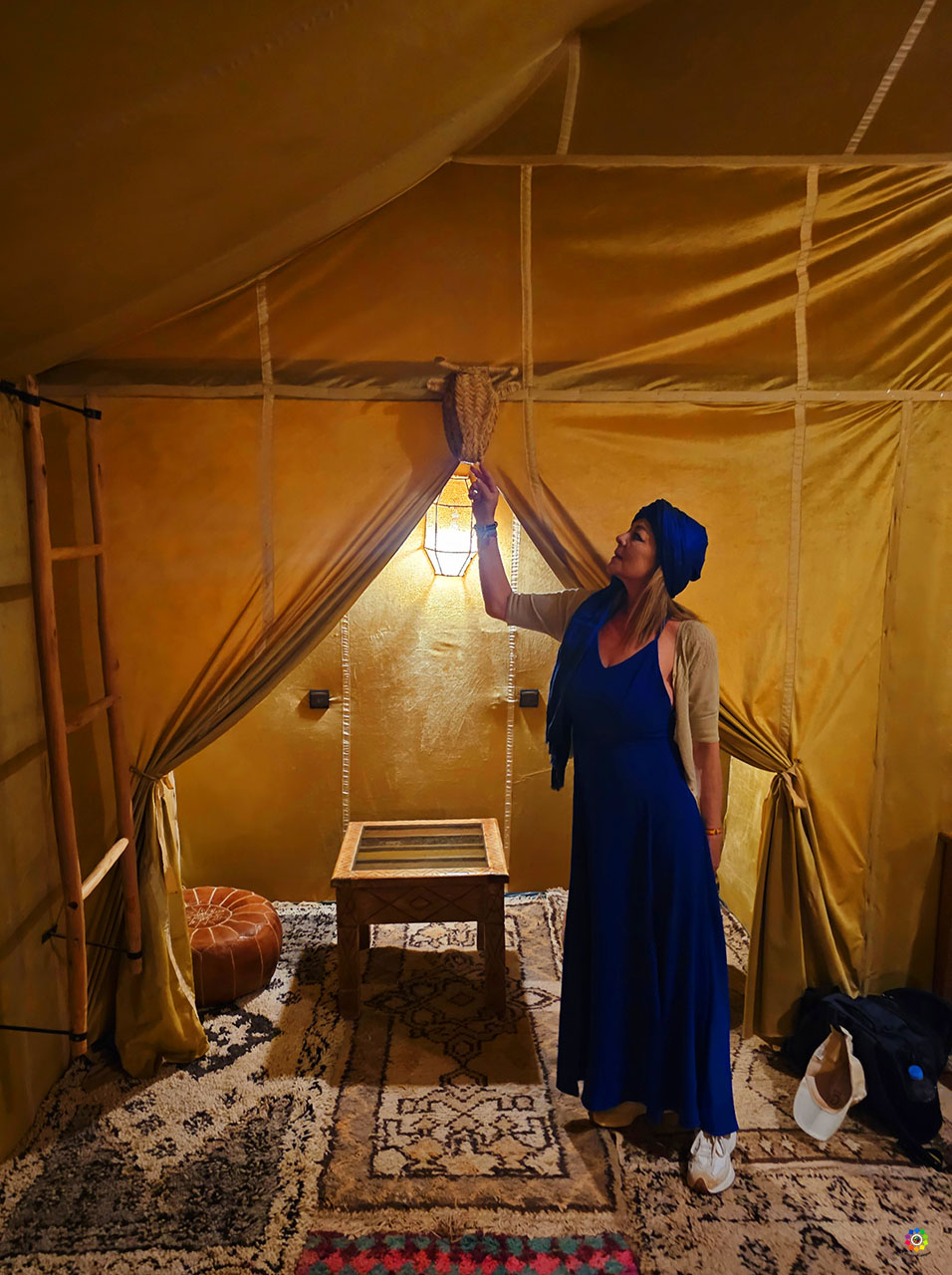 Llegarás al anochecer al campamento en medio del desierto donde te espera una haima de lujo para pasar la noche. Otras excursiones te ofrecen pasar la noche en el desierto pero en una haima que no es de lujo, ojo a esto porque hay mucha diferencia. En la de lujo estarás como en un hotel, son super amplias, con baño y ducha privados y hasta tienen una pequeña terraza delante de la haima con una mesita y sillas para tomar algo y una tumbona tipo balinesa ( sin las cortinas) para relajarte leyendo o tomar el sol. Los que no son de lujo tienen el baño compartido. También tienen en las haimas cargadores para el teléfono tipo usb, no es de 220v por lo que te recomiendo llevar una bateria externa para cargar. También puedes utilizar los enchufes que tienen en el restaurante a la hora de cenar/desayunar para cargar el teléfono. Después de una cena con productos típicos de la gastronomía local, podrás disfrutar de un momento estupendo bajo las estrellas con música tradicional en directo alrededor de una hoguera. Te recomiendo mirar al cielo con atención, es una auténtica maravilla la cantidad de estrellas que verás desde aquí. A la mañana siguiente, madruga, hazlo aunque te cueste y camina hasta las dunas para ver el amanecer. Es una experiencia única que vale la pena. Después te esperará un estupendo desayuno y continuar tu viaje.