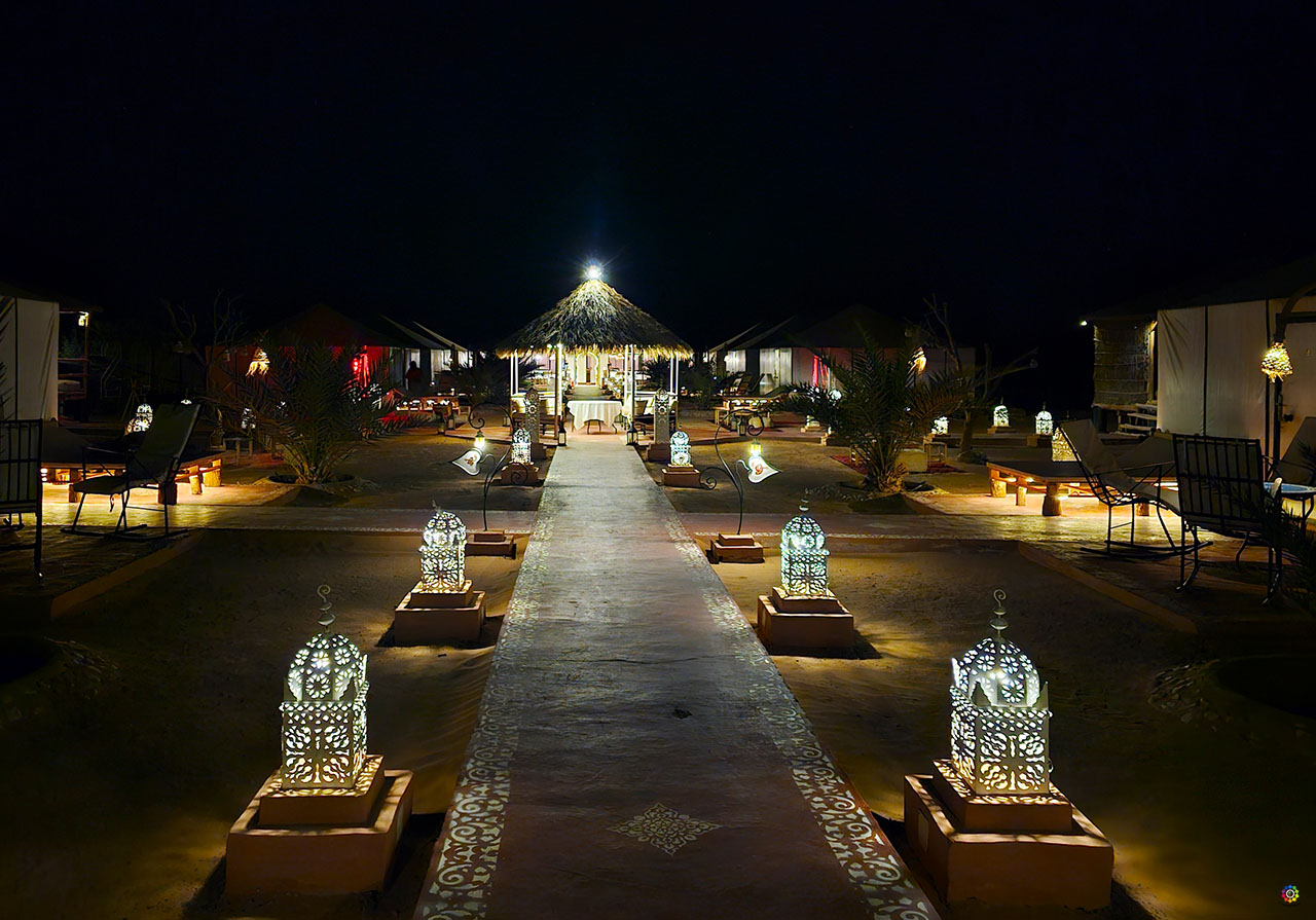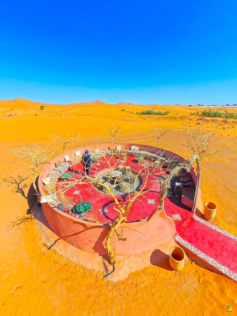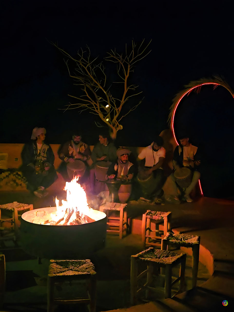 Llegarás al anochecer al campamento en medio del desierto donde te espera una haima de lujo para pasar la noche. Otras excursiones te ofrecen pasar la noche en el desierto pero en una haima que no es de lujo, ojo a esto porque hay mucha diferencia. En la de lujo estarás como en un hotel, son super amplias, con baño y ducha privados y hasta tienen una pequeña terraza delante de la haima con una mesita y sillas para tomar algo y una tumbona tipo balinesa ( sin las cortinas) para relajarte leyendo o tomar el sol. Los que no son de lujo tienen el baño compartido. También tienen en las haimas cargadores para el teléfono tipo usb, no es de 220v por lo que te recomiendo llevar una bateria externa para cargar. También puedes utilizar los enchufes que tienen en el restaurante a la hora de cenar/desayunar para cargar el teléfono. Después de una cena con productos típicos de la gastronomía local, podrás disfrutar de un momento estupendo bajo las estrellas con música tradicional en directo alrededor de una hoguera. Te recomiendo mirar al cielo con atención, es una auténtica maravilla la cantidad de estrellas que verás desde aquí. A la mañana siguiente, madruga, hazlo aunque te cueste y camina hasta las dunas para ver el amanecer. Es una experiencia única que vale la pena. Después te esperará un estupendo desayuno y continuar tu viaje.