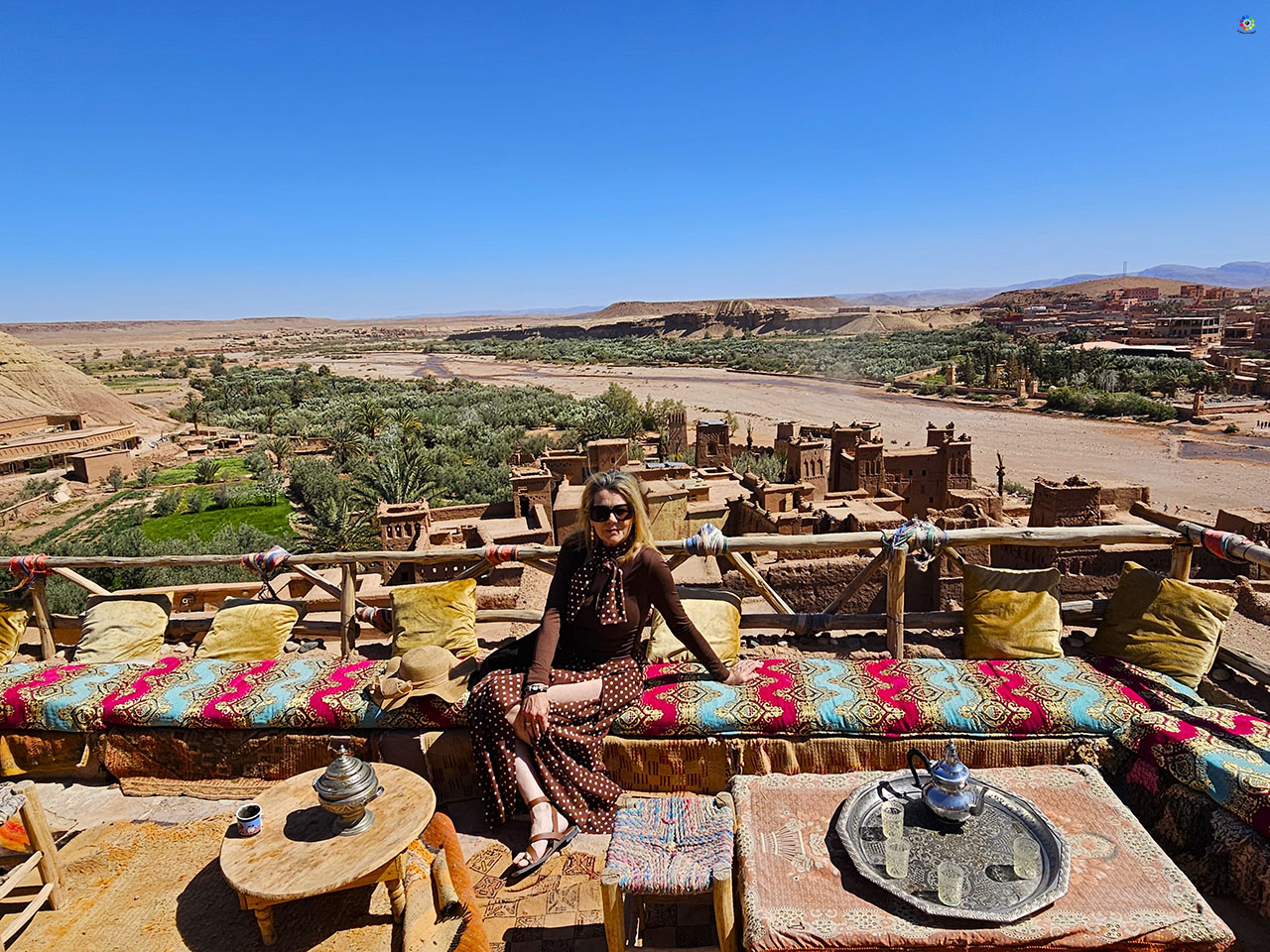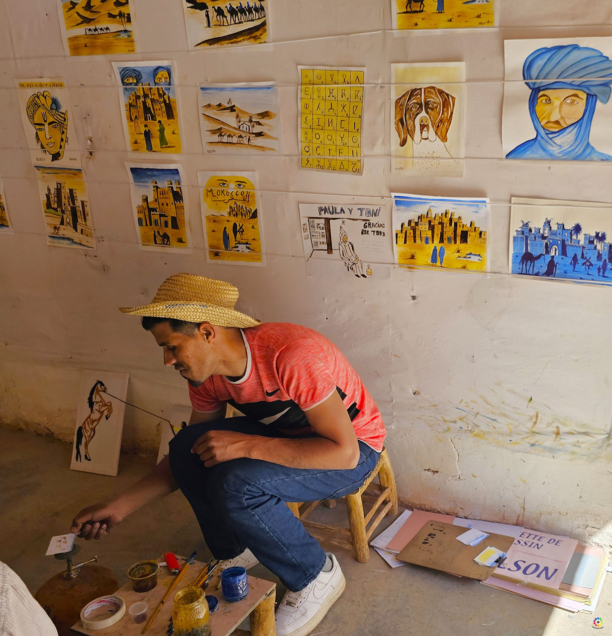 Además de su valor histórico, la kasbah de Ait Ben Haddou ofrece una experiencia cultural completa. Sus calles están llenas de tiendas y talleres de artesanía local donde se pueden encontrar alfombras, cerámica, joyas bereberes y tejidos tradicionales. Todo ello rodeado de un entorno natural que invita a relajarse y dejarse llevar por el encanto del sur de Marruecos. Podrás ver a artesanos locales realizando auténticas obras de arte: Nos llamó mucho la atención uno que dibujaba sus cuadros con el fuego creado a través de un cristal a modo de lupa y otro que los pintaba con una técnica utilizada antiguamente para enviarse mensajes sin ser detectados, con tintes naturales y aplicando fuego por el reverso del papel, es como ver magia cuando se va transformando en un cuadro como si se hubiese pintado . Además este primer día tuvimos la suerte de comer en un restaurante que nos habían reservado con unas vistas maravillosas a la Kasbah.