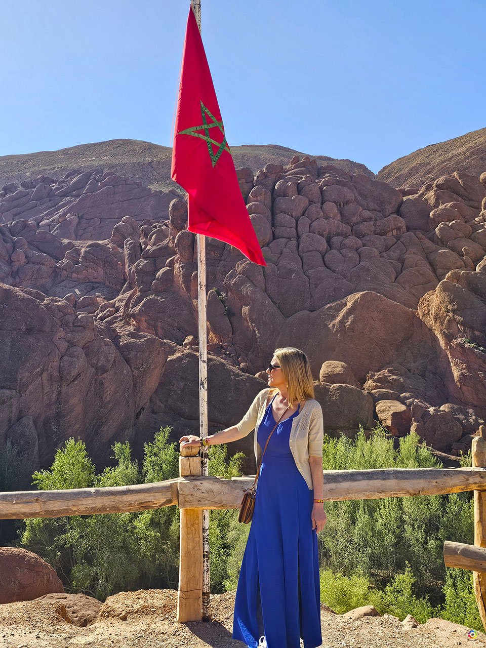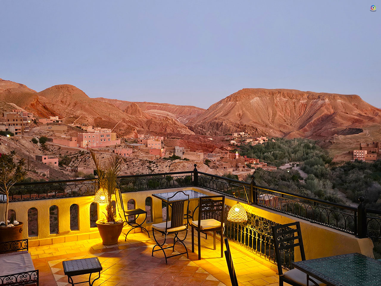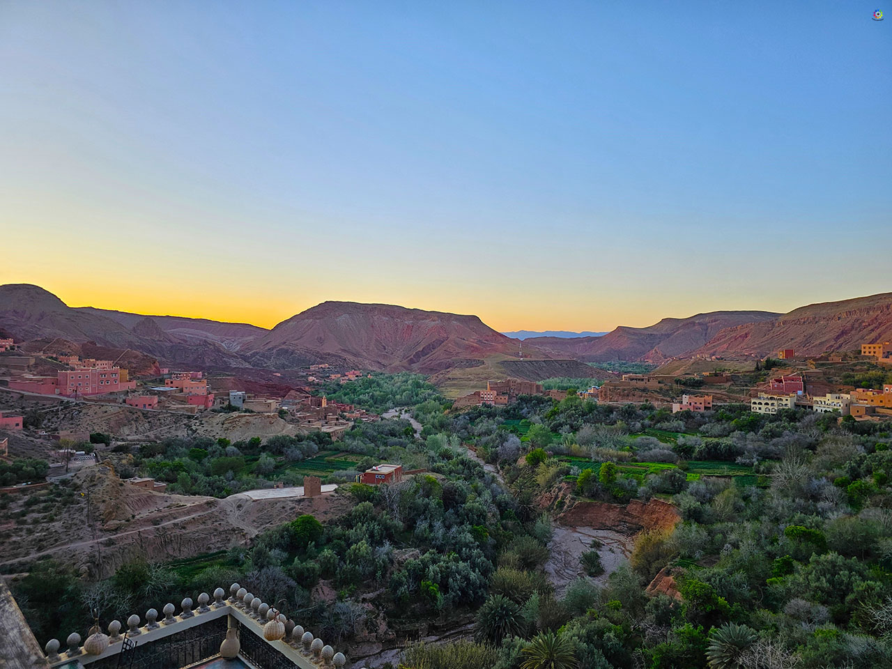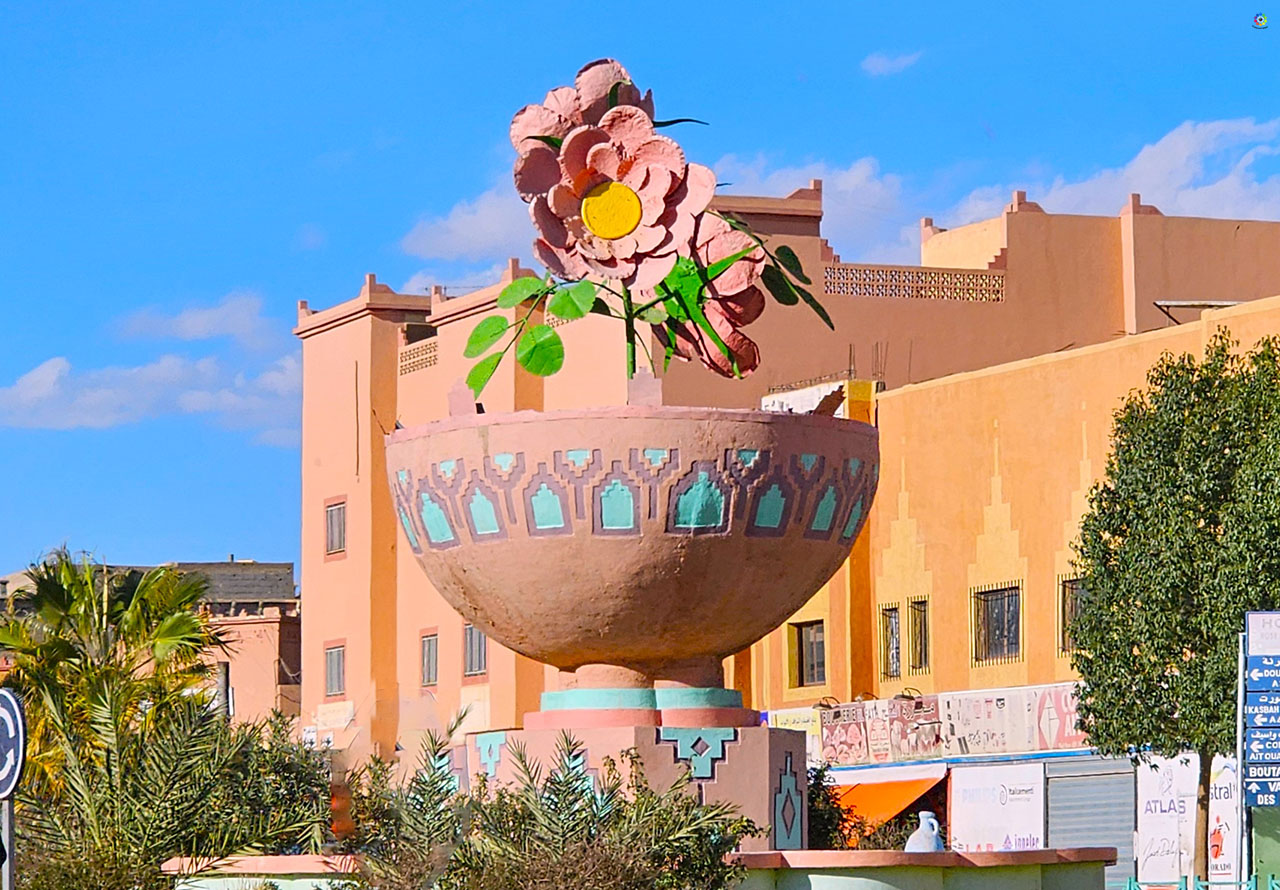 ¿ Sabías que cuando algún elemento destaca en una ciudad de Marruecos , este suele estar representado en la rotonda de entrada a la ciudad? Fíjate en tu viaje y verás más de uno, como las rosas de el Valle de las Rosas , en este lugar hasta los taxis son de color rosa. Más o menos a finales de abril abren miles de rosas, todas de color rosa en este lugar mágico. Se cree que la rosa damascena, la variedad predominante en la zona, fue introducida por comerciantes o peregrinos que regresaban de la Meca, posiblemente en el siglo X. Es un importante centro de producción de aceite y agua de rosas. Al atardecer llegamos al Valle de Dades, donde pasaremos la noche. El hotel en el Valle de Dades era espectacular. Nos recibieron con un te en la terraza con vistazas al valle y las instalaciones, con piscina incluida , nos encantaron. Una estupenda cena y a descansar hasta la mañana siguiente .