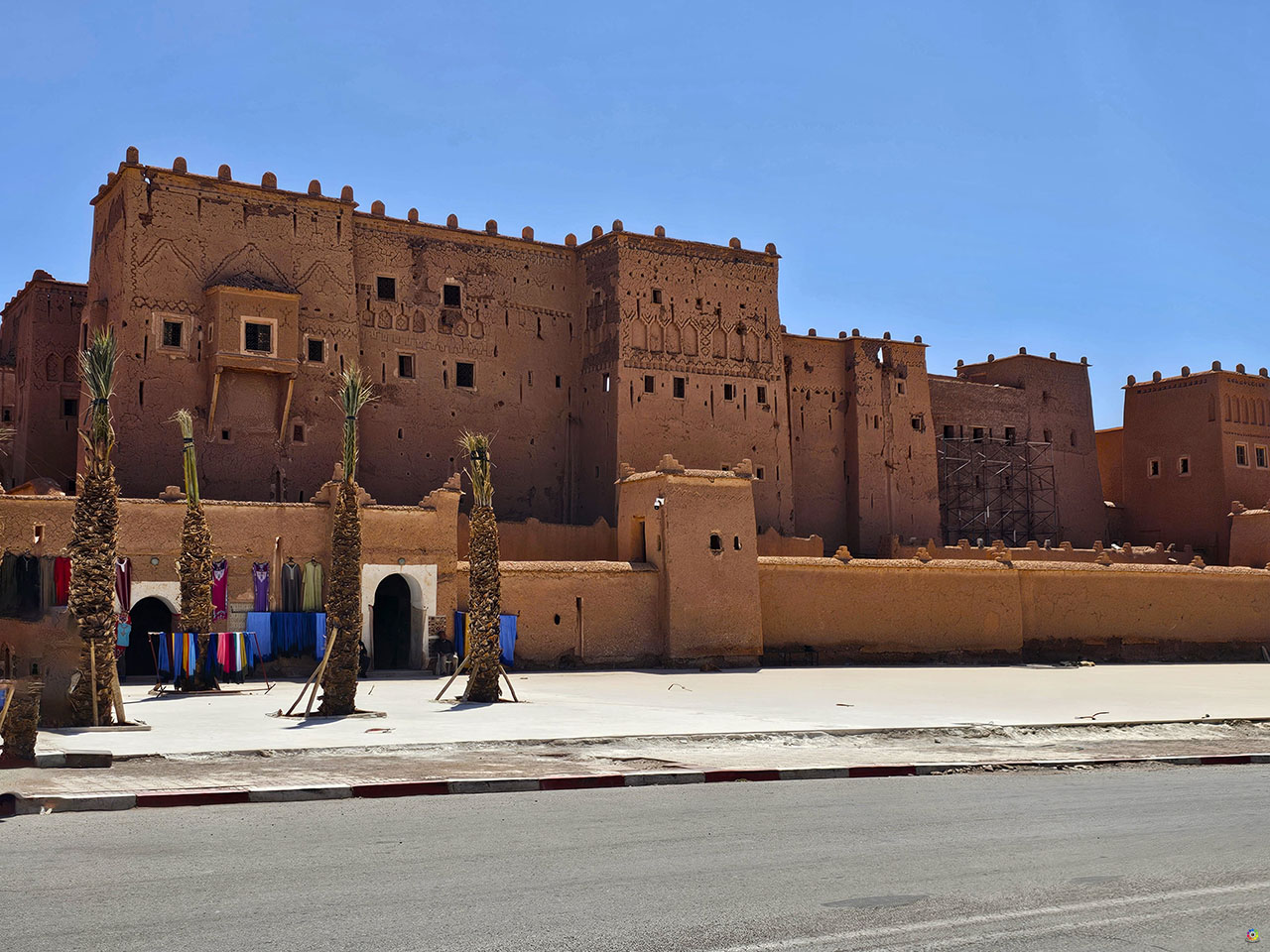 Hacemos otra parada en La Kasbah de Taourirt en Ouarzazate, es una de las kasbahs mejor conservadas del país, y está considerada una de las más antiguas. Esta estructura, construida con adobe, se encuentra a las afueras de Ouarzazate y es un importante patrimonio de la ciudad, clasificado como Patrimonio de la Humanidad por la UNESCO.