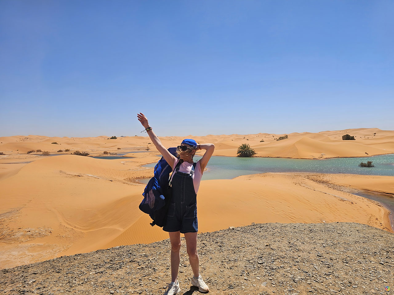 Después de tanta inmensidad oscura, cubierta de restos de rocas, fósiles , vegetación típica del desierto, y haber estado a unos 15km de la frontera con Argelia, descubrimos un lugar excepcional, que se formó por primera vez en la historia en una zona del desierto de Erg Chebbi. Otro de los lugares que solo podrás descubrir con esta excursión. En el desierto hay otro lago más famoso, el lago Yasmina que que se ha vuelto a llenar tras fuertes lluvias, algo que no ocurría desde la década de 1970. Es un lago de pequeño tamaño, con una extensión aproximada de 3 km de largo y 1 km de ancho, y una profundidad de 3 a 5 metros. Pero el que visitamos nosotros es uno totalmente nuevo, formado por las fuertes lluvias de septiembre y que poco a poco va perdiendo profundidad. Un lugar realmente precioso.