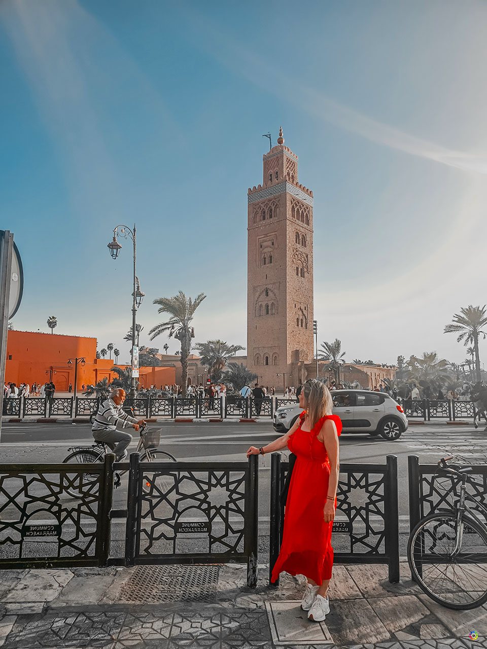 Este primer día es perfecto para perderse por la medina de Marrakech, recorrer sus estrechas callejuelas y explorar mercados llenos de vida. Nosotros , después de instalarnos en el estupendo riad que nos habían reservado, aprovechamos para ir caminando hasta la Mezquita Kutubia, no se puede acceder al interior, pero vale la pena acercarse a verla y de ahí a Plaza Jemaa el Fna, la más famosa y concurrida de Marrakech. Llegamos al atardecer y coincidiendo con el fin del Ramadán, ese día todos festejan en la plaza y estaba abarrotada de gente, puestos de todo tipo: comida, venta de frutas, especias, artículos variados, mezclándose con músicos y turistas. Como la cena del primer día no está incluida aprovechamos para cenar aquí. Por un momento estuvimos tentados a cenar en uno de los puestos de la Plaza, pero teniendo en cuenta que era el primer día y si nos sienta mal la comida podíamos estropear todo el viaje, optamos por un restaurante en la misma plaza y fue todo un acierto. Se llama Tajin Darna y cuenta con una terraza estupenda desde donde puedes cenar viendo la puesta de sol tras la Mezquita y toda la Plaza ( solo dejan acceder a la terraza si vas a cenar) . Aquí puedes tomarte un Tajin o couscous por unos 7 a 10€ al cambio. también tienen hamburguesas y pizzas, aunque te recomendamos probar la gastronomía local. Y después de cenar, de vuelta al Riad que al día siguiente comenzaba nuestra aventura.
