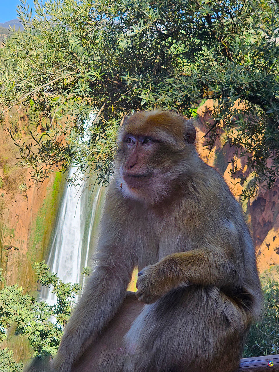 Después de comer comenzamos el ascenso por la parte opuesta a la que habíamos bajado, justo en frente de la cascada. Una parada en los miradores con vistazas y subida a la zona donde están los monos de berbería. En la subida verás también tiendas de souvenirs para llevarte un recuerdo. Ahí te encontrarás a locales vendiendo cacahuetes para darles a los monos y hacerse la foto con ellos, nuestra opinión es que lo mejor es no interactuar con los monos, hemos visto gente dándoles hasta una bolsa de chetos y , la verdad, no nos gusta nada eso. De todas formas, ten en cuenta que son animales salvajes, no lleves nada a lo que le puedan echar la mano, no es el primer móvil que se llevan en otros lugares y estos no creo que sean distintos. Nuestro consejo: míralos, hazles fotos o videos pero no interactúes con ellos.