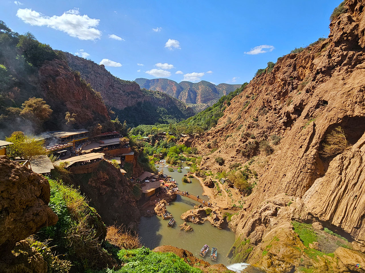 Al llegar comenzarás la ruta hacía las cascadas viéndolas desde la parte superior. A continuación bajarás por el sendero disfrutando de la vegetación y los puestos de artesanía local y souvenirs. Sabías que esta zona está llena de olivos centenarios? Son los que dan nombre a las cascadas, esto y muchos otros detalles te los descubrirá el guía durante la ruta. Desde esta parte de la ruta podrás ver las cuevas en las que viven los monos de berberia . El agua nace del deshielo del alto Atlas y tienen caudal todo el año. Ubicadas en un entorno de tierra arcillosa y vegetación exuberante, las cascadas se desploman por un desfiladero natural en el curso del río Ouzoud, creando una estampa mágica que se completa con el arco iris que a menudo aparece por la bruma que deja el agua al chocar contra las rocas. En la parte inferior de las cascadas podrás acercarte a la misma base en una de las balsas por solo 20 dírhams (2€), es una experiencia increíble. También puedes bañarte , ideal para cuando hace mucho calor. Aunque el color del agua tiene un tono marrón, no es porque esté sucia, esto se debe a la base arcillosa de la tierra .