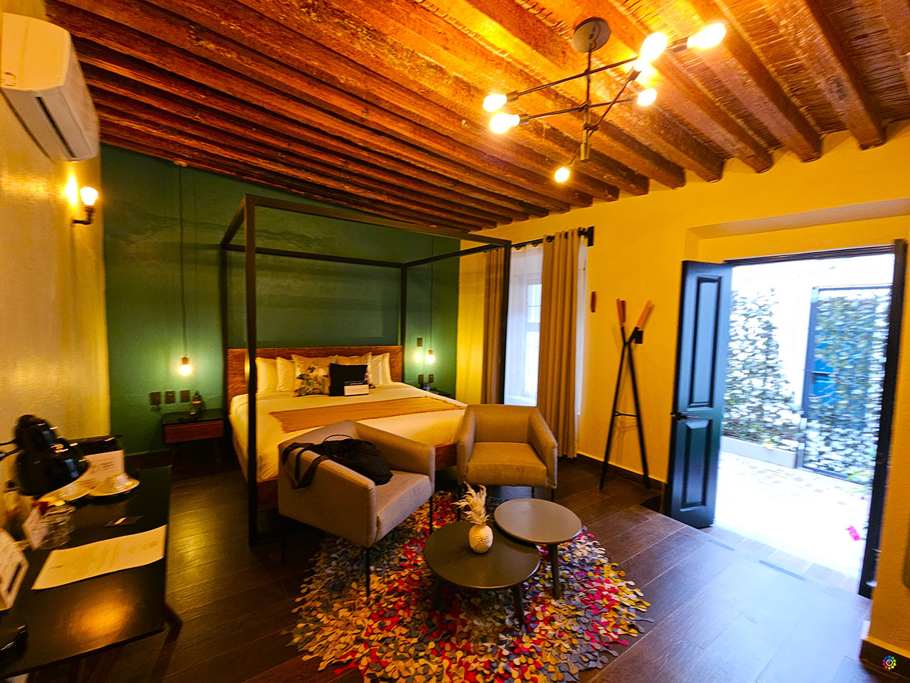 Las habitaciones son amplias, modernas y muy cómodas, con detalles que marcan la diferencia. En nuestro caso, tuvimos la suerte de alojarnos en una habitación que contaba con una terraza privada y jacuzzi exterior, un auténtico lujo para relajarse tras un día recorriendo Guanajuato. Además, el hotel dispone de una pequeña piscina en las zonas comunes, ideal para refrescarse.