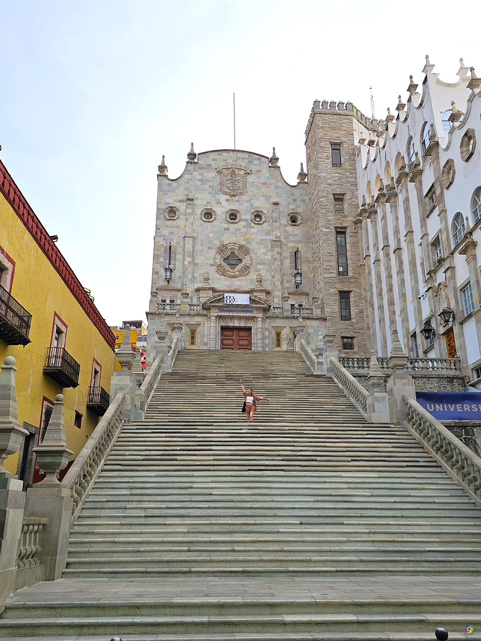 En pleno corazón de Guanajuato se alza uno de los edificios más emblemáticos de la ciudad: el Edificio Central de la Universidad de Guanajuato. Su imponente escalinata de 86 peldaños no solo invita a los visitantes a subirla, sino que se ha convertido en uno de los símbolos más reconocibles de la ciudad. Pero detrás de su majestuosa fachada de cantera verde y morada se esconde una historia que se remonta al siglo XVIII, cuando en este mismo lugar los jesuitas fundaron el Hospicio de la Santísima Trinidad en 1732. Aquel antiguo colegio jesuita fue el punto de partida de una evolución que daría paso, siglos después, a la universidad que hoy sigue dando vida cultural y académica a Guanajuato.