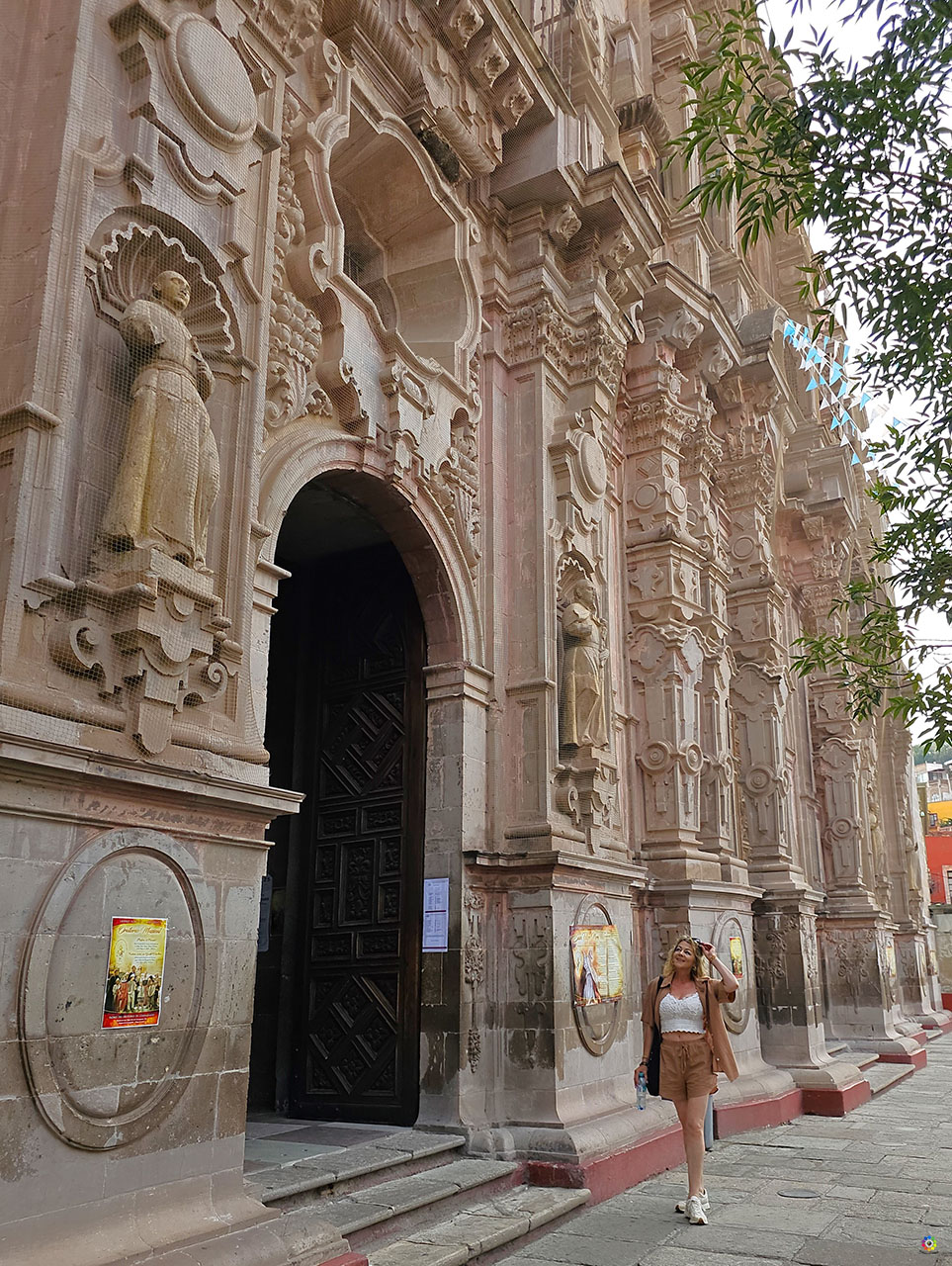 Si continuas tu paseo por la calle de la derecha de la Universidad, decorada con papel picado, llegarás a otro de los lugares que no te puedes perder en Guanajuato, el Templo de la Compañía de Jesús.