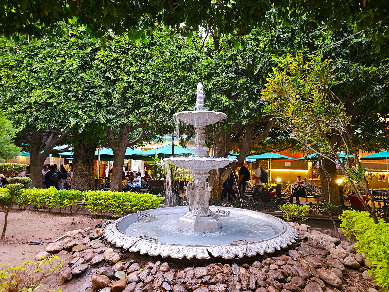 Su nombre rinde homenaje a San Fernando y al monarca Fernando VII, y su encanto reside no solo en la tranquilidad que ofrece, sino también en su estética. El empedrado de la plaza, decorado con figuras geométricas en forma de grecas, fue diseñado por el célebre artista guanajuatense José Chávez Morado, y le otorga una personalidad única entre los espacios públicos de la ciudad. A todo esto se suma una fuente central de estilo barroco y las coloridas fachadas que la rodean, muchas de ellas hoy reconvertidas en cafeterías, restaurantes y hostales con terrazas que miran directamente a la plaza, perfectas para desayunar, comer o simplemente tomar un café a la sombra de los árboles.