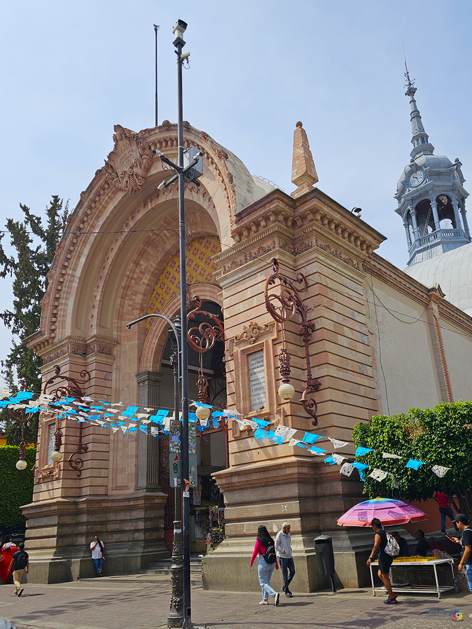 Construido sobre los restos de una antigua plaza de toros, su inauguración tuvo lugar en 1910 como parte de los festejos por el centenario de la Independencia de México. Su diseño llama la atención desde el primer vistazo: una fachada imponente de cantera rosa, grandes ventanales, arcos de medio punto y una majestuosa torre central con reloj. La estructura metálica, inspirada en las estaciones ferroviarias europeas de la época, le confiere un aire industrial y elegante que lo distingue de cualquier otro mercado tradicional mexicano.